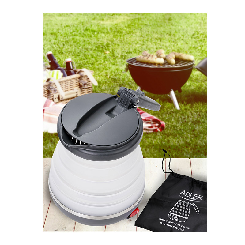 Ο βραστήρας, από την εταιρία Adler, έχει αναδιπλούμενο σχεδιασμό και σώμα από μαλακή σιλικόνη, για εύκολη αποθήκευση. Διαθέτει πτυσσόμενη λαβή από πλαστικό, αυτόματη απενεργοποίηση μετά το βρασμό, φωτιζόμενο διακόπτη ενεργοποίησης / απενεργοποίησης και χωρητικότητα 0.6 Lt.