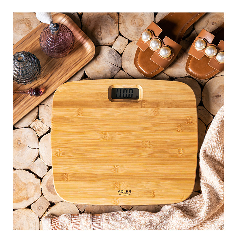 Η ψηφιακή ζυγαριά μπάνιου, από την εταιρία Adler, είναι κατασκευασμένη από ξύλο μπαμπού και έχει μέγιστο βάρος ζύγισης τα 150 Kg. Με υψηλή ακρίβειά 100 g, ένδειξη χαμηλής μπαταρίας, ένδειξη υπερβολικού φορτίου και αυτόματη ενεργοποίηση/απενεργοποίηση.