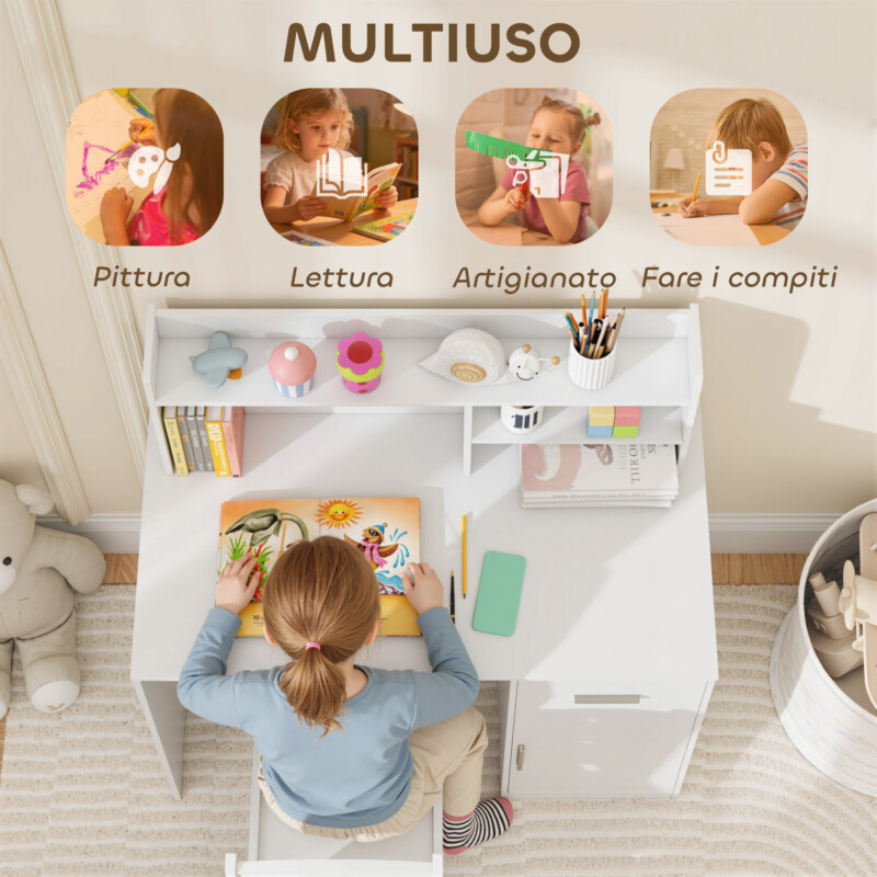 AIYAPLAY Παιδικό Γραφείο με Ράφια, Ντουλαπάκι, Συρτάρι και Ταιριαστή Καρέκλα για Παιδιά σε Λευκό MDF 312-156V80WT