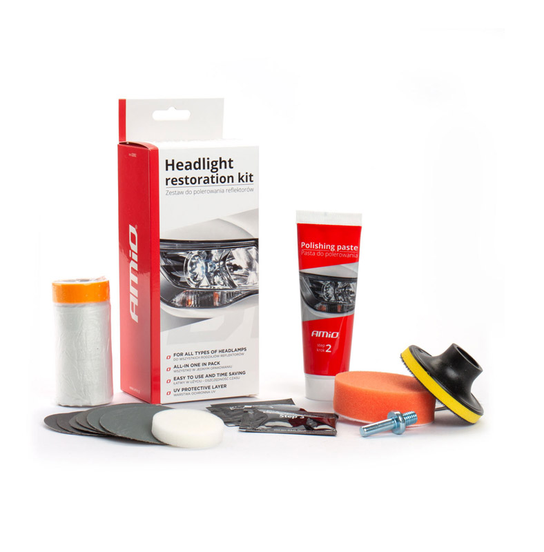 Το σετ, από την εταιρία AMiO, είναι σχεδιασμένο για να επαναφέρει την αρχική λάμψη των πολύ θαμπών, κιτρινισμένων φαναριών στο αυτοκίνητο.