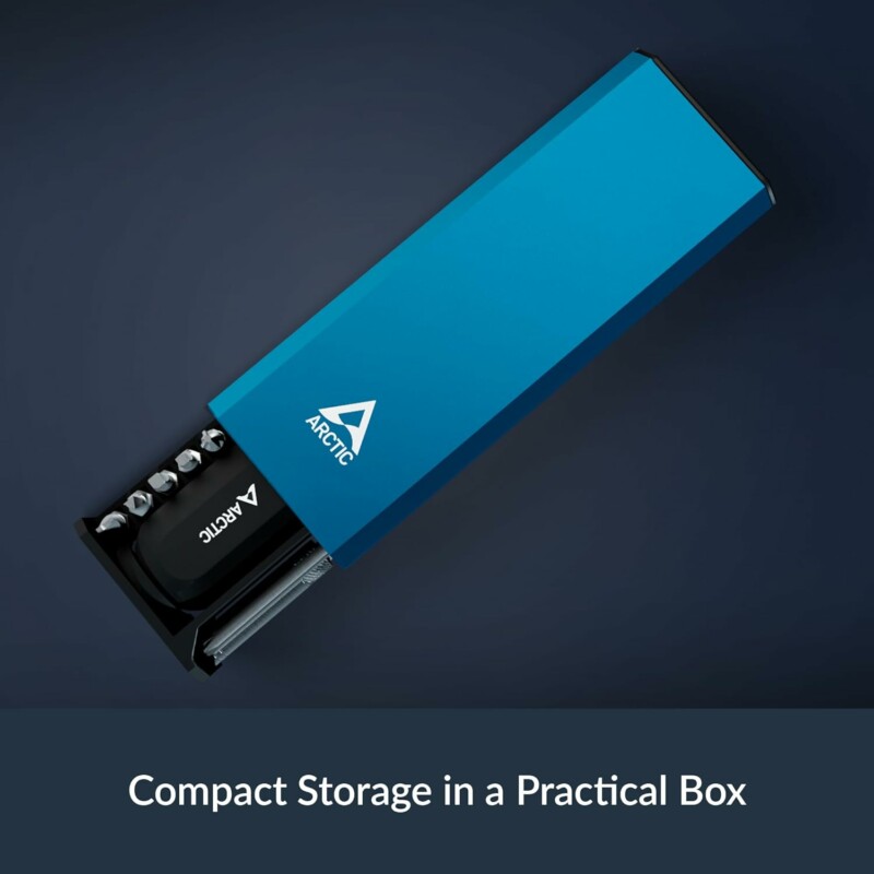 Το σετ παραδίδεται σε μία στιβαρή μαγνητική κασετίνα διαλογής με περίβλημα από αλουμίνιο, το οποίο προσφέρει χώρο για όλες τις μύτες και το κατσαβίδι – ιδανικό για εν κινήσει και για ξεκάθαρη αποθήκευση.