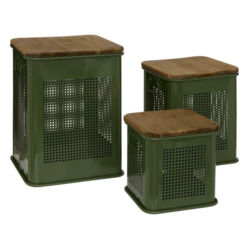 Το σετ των 3 διακοσμητικών μπαούλων Azae Atmosphera αποτελείται από 3 μπαούλα αποθήκευσης κατασκευασμένα από διάτρητο ατσάλι, εξοπλισμένα με πλευρικές λαβές για εύκολη μεταφορά. Συμπληρωματικά σε μέγεθος, κλείνουν με καπάκι από ξύλο έλατου που τους δίνει ένα κομψό και ζεστό στυλ. Μπορείτε να χρησιμοποιήσετε τον αποθηκευτικό όγκο αυτών των μπαούλων σε μια κρεβατοκάμαρα ή γκαρνταρόμπα για να αποθηκεύσετε λευκά είδη ή αξεσουάρ και να διατηρήσετε έναν τακτοποιημένο εσωτερικό χώρο.
