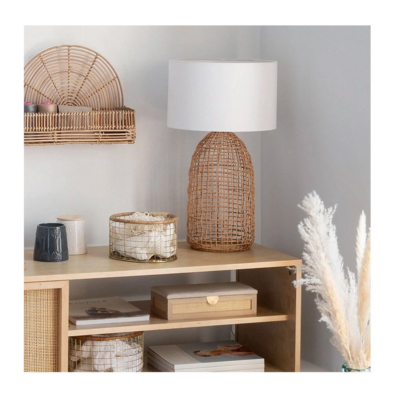 Το επιτραπέζιο φωτιστικό, από την εταιρία Atmosphera, διαθέτει σκελετό από μέταλλο σε λευκό χρώμα με επένδυση από ψάθα. Φέρει λευκό υφασμάτινο καπέλο από polyester και βαμβάκι. Εξοπλισμένο με λευκό καλώδιο μήκους 150 cm και υποδοχή λαμπτήρα E27 έως 25 W (δεν περιλαμβάνεται).