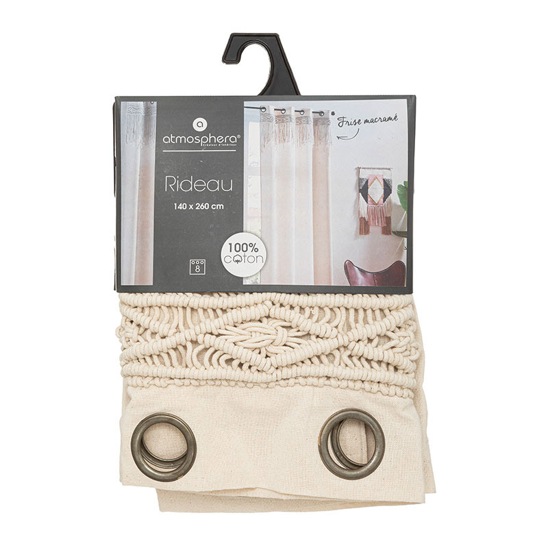 Η κουρτίνα, από την εταιρία Atmosphera, είναι κατάλληλη για όλους τους χώρους του σπιτιού. Μέτριας σκίασης, από 100% βαμβάκι σε μπεζ χρώμα με Macrame σχέδιο και κρόσσια. Διαθέτει 8 ενσωματωμένα τρουκς για εύκολη τοποθέτηση.