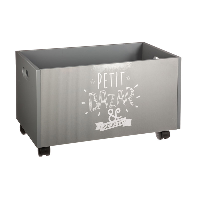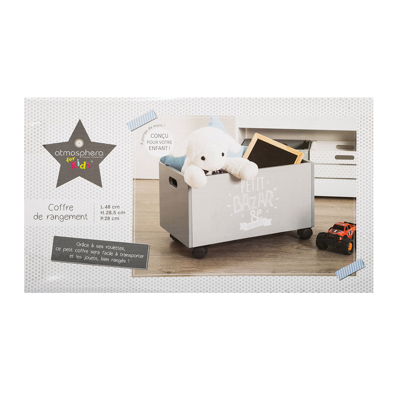 Το κουτί αποθήκευσης παιχνιδιών, από την εταιρία Atmosphera, είναι κατασκευασμένο από ξύλο MDF σε γκρι χρώμα και λεπτομέρειες σε λευκή απόχρωση. Έχει ροδάκια με φρένα για να μπορεί να μετακινείται και για να μπορεί να μένει σταθερό. Εξοικονομεί χώρο στο παιδικό ή βρεφικό δωμάτιο διατηρώντας το τακτοποιημένο.