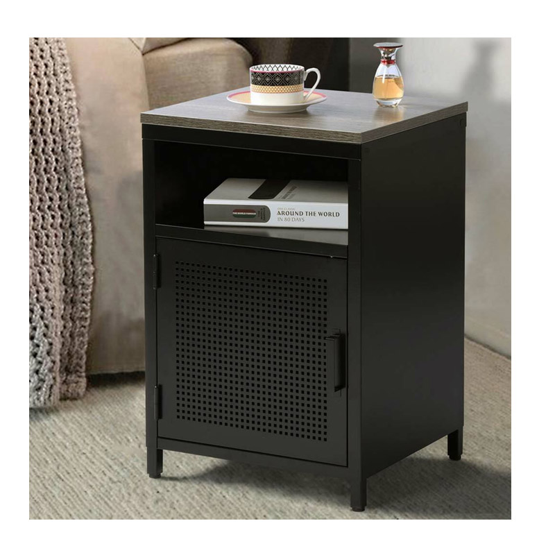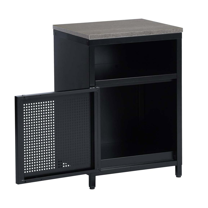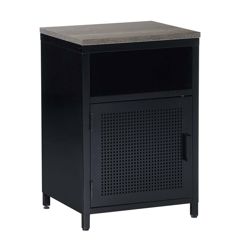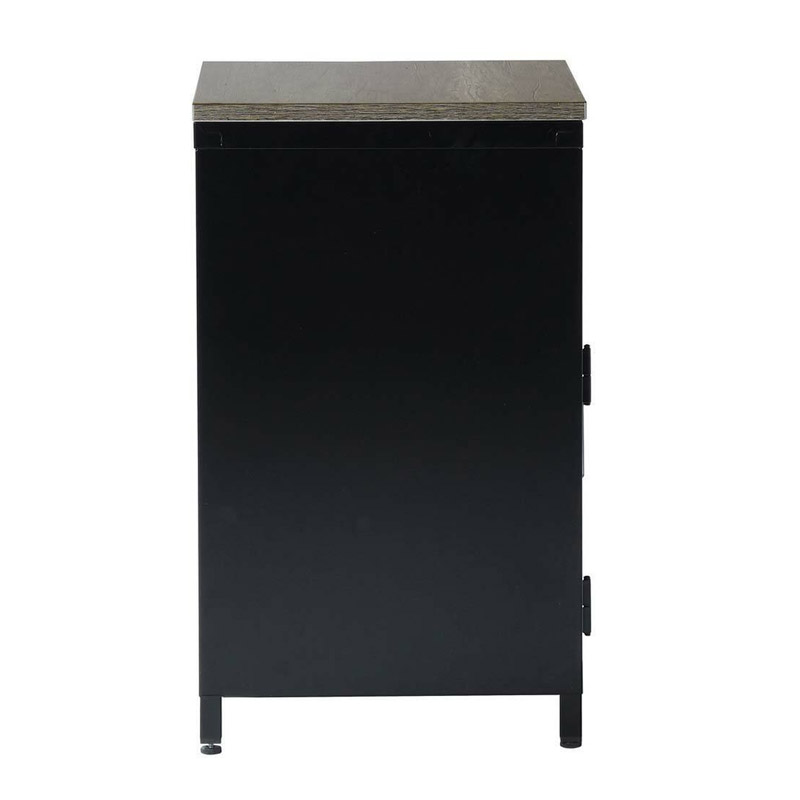 Το κομοδίνο, από την εταιρία Bakaji, είναι κατασκευασμένο εξ ολοκλήρου από μέταλλο με βαφή πούδρας σε μαύρο χρώμα. Διαθέτει επάνω επιφάνεια στήριξης ξύλο MDF σε καφέ χρώμα, 1 ανοιχτό ράφι και 1 ευρύχωρο ντουλάπι με διάτρητη πόρτα.
