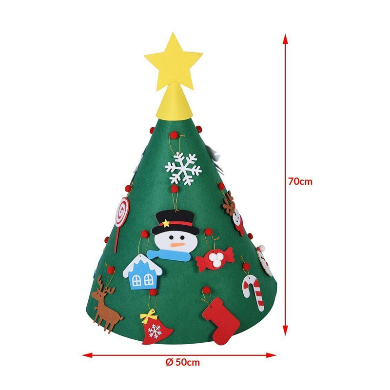 Το χριστουγεννιάτικο δέντρο, από την εταιρία Bakaji, είναι κατασκευασμένο εξ ολοκλήρου από υψηλής ποιότητας τσόχα με εξαιρετικά ανθεκτική διπλή ραφή, έχει βάση 50 cm και έχει ύψος 70 cm. Το δέντρο είναι εξοπλισμένο με πολλά βελούδινα κουμπιά όπου μπορείτε να κρεμάσετε τα 15 χριστουγεννιάτικα στολίδια που περιλαμβάνονται στη συσκευασία όπως προτιμάτε.