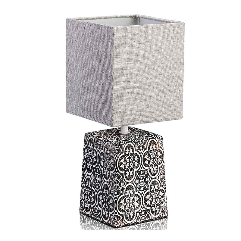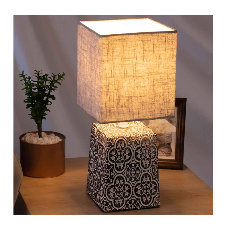 Το επιτραπέζιο φωτιστικό, από την εταιρία Bakaji, διαθέτει κεραμική βάση σε σχήμα κύβου με λευκή διακοσμητική υφή και ένα όμορφο παραλληλόγραμμο υφασμάτινο αμπαζούρ σε γκρι χρώμα. Είναι εξοπλισμένο με υποδοχή για λαμπτήρα E27 έως 40 W, διακόπτη ON / OFF και καλώδιο 1.5 m.