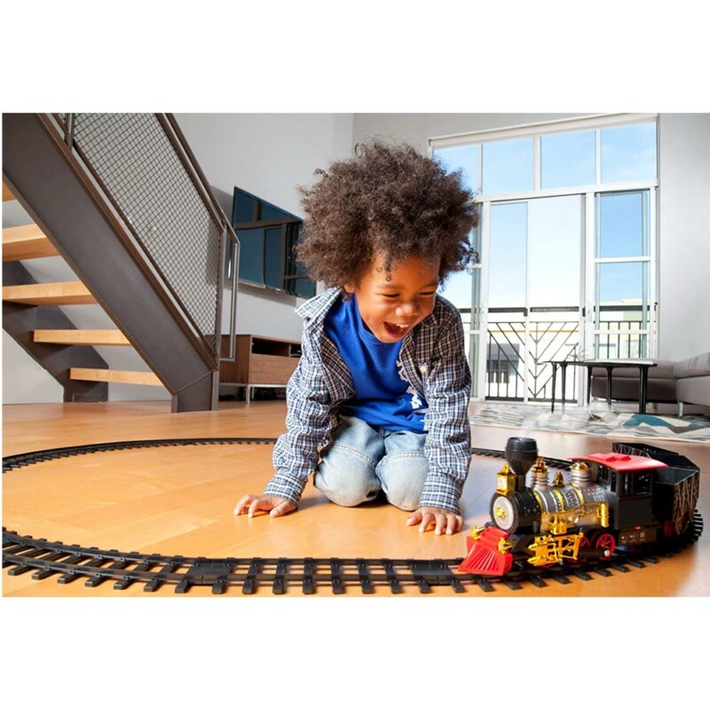Αυτό το υπέροχο σετ περιλαμβάνει έναν μακρύ κυκλικό σιδηρόδρομο με διάμετρο 71 εκ., πάνω στον οποίο ταξιδεύει μια όμορφη ατμομηχανή με κλασικό σχεδιασμό, λεπτομερής έως την τελευταία λεπτομέρεια, που παραπέμπει στις ατμομηχανές άλλων εποχών. Ακολουθείται από 3 φορτηγά βαγόνια που συνδέονται με την ατμομηχανή, περιδιαβαίνοντας όλη τη διαδρομή της πίσταs.