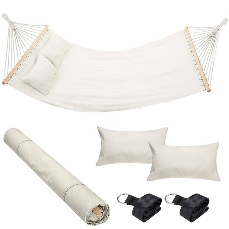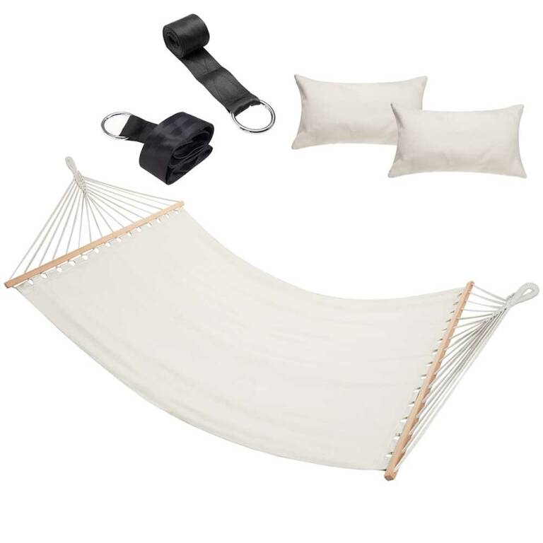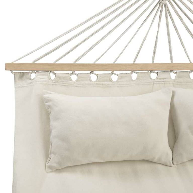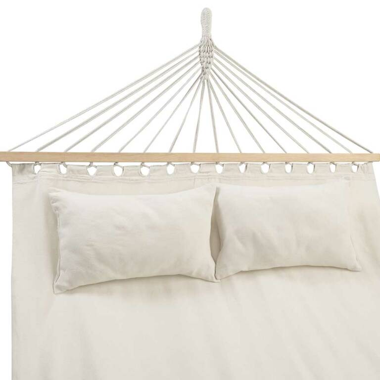 Εξαιρετική εξωτερική αιώρα με 2 ξύλινες εγκάρσιες ράβδους μήκους 150 cm, πάνω στις οποίες είναι σταθερά τοποθετημένο το άνετο βαμβακερό πανί διαστάσεων 232 x 148 cm, προσφέροντας άφθονο χώρο για 2 άτομα. Επιπλέον, τα 2 μαλακά μαξιλάρια που περιλαμβάνονται στη συσκευασία θα κάνουν τη χρήση της αιώρας σας ακόμα πιο άνετη.