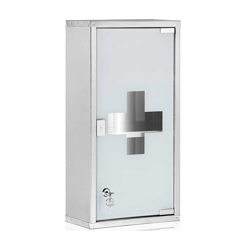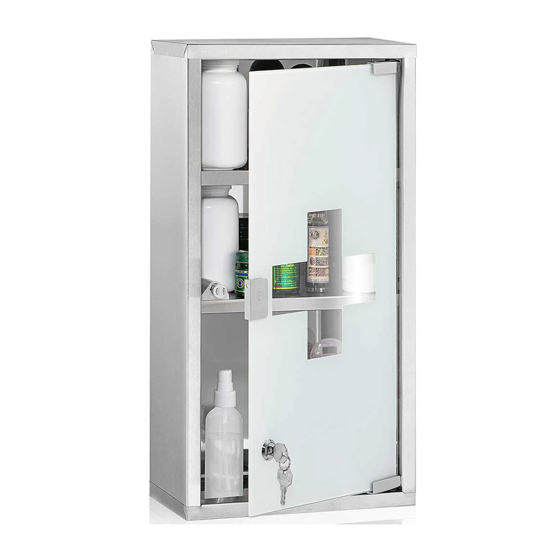 Το ντουλάπι φαρμακείου, από την εταιρία Bakaji, είναι κατασκευασμένο από βουρτσισμένο ανοξείδωτο ατσάλι. Διαθέτει 3 ράφια και γυάλινη ματ πόρτα, που ασφαλίζει με κλειδί. Εξασφαλίζει μια ασφαλή και οργανωμένη αποθήκευση των φαρμάκων και άλλων πρώτων βοηθειών και είναι ιδανικό για ιατρείο, σπίτι, γραφείο, αθλητικό σωματείο και εργαστήριο.