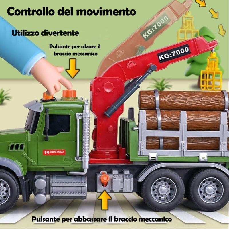 - Εύκολο στη Χρήση: Η γερανοφόρος ρυμούλκα διαθέτει αρθρωτό βραχίονα που κινείται και περιστρέφεται κατά 60 μοίρες, επιτρέποντας στα παιδιά να μετακινούν κορμούς σαν πραγματικοί οδηγοι φορτηγού.
