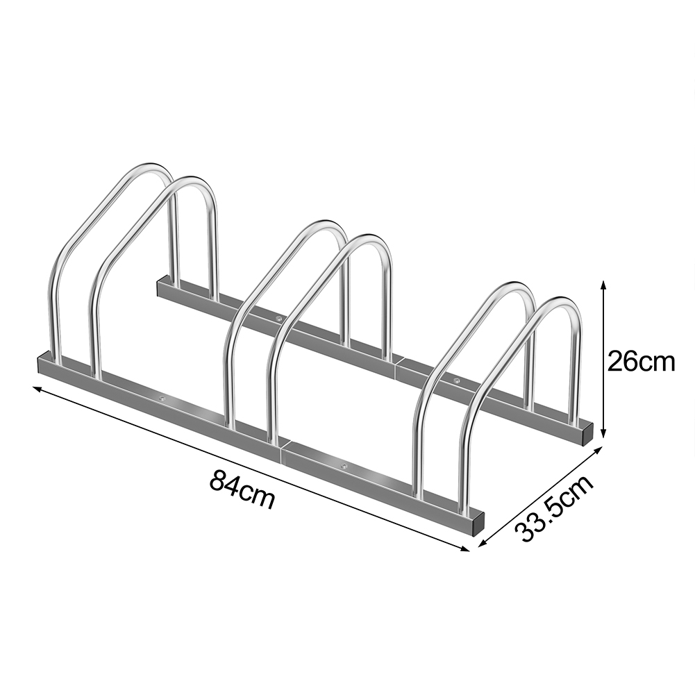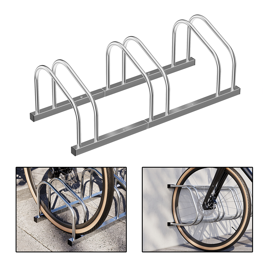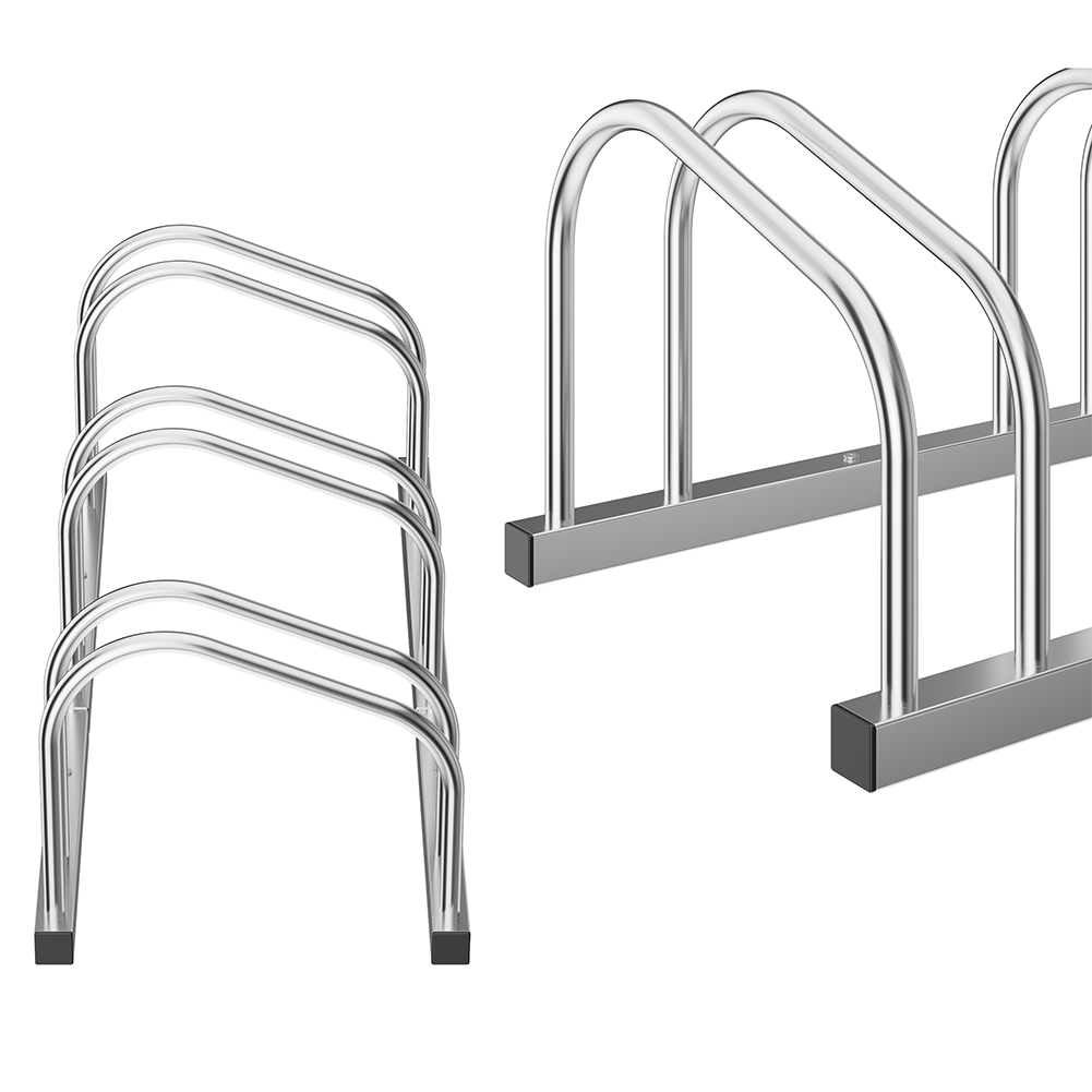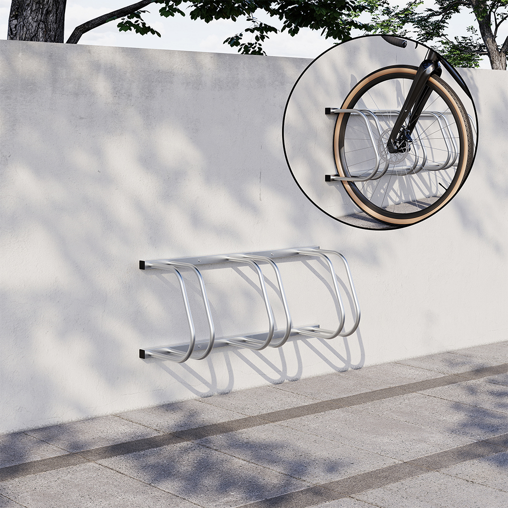 Ραφιέρα ποδηλάτων εξωτερικού χώρου, ιδανική για τοποθέτηση στο έδαφος ή στον τοίχο. Χάρη στις πλευρικές της βάσεις, μπορεί να φιλοξενήσει έως και τρία ποδήλατα.