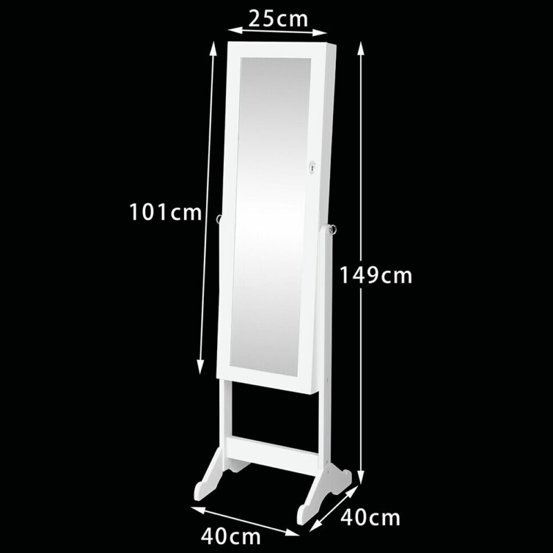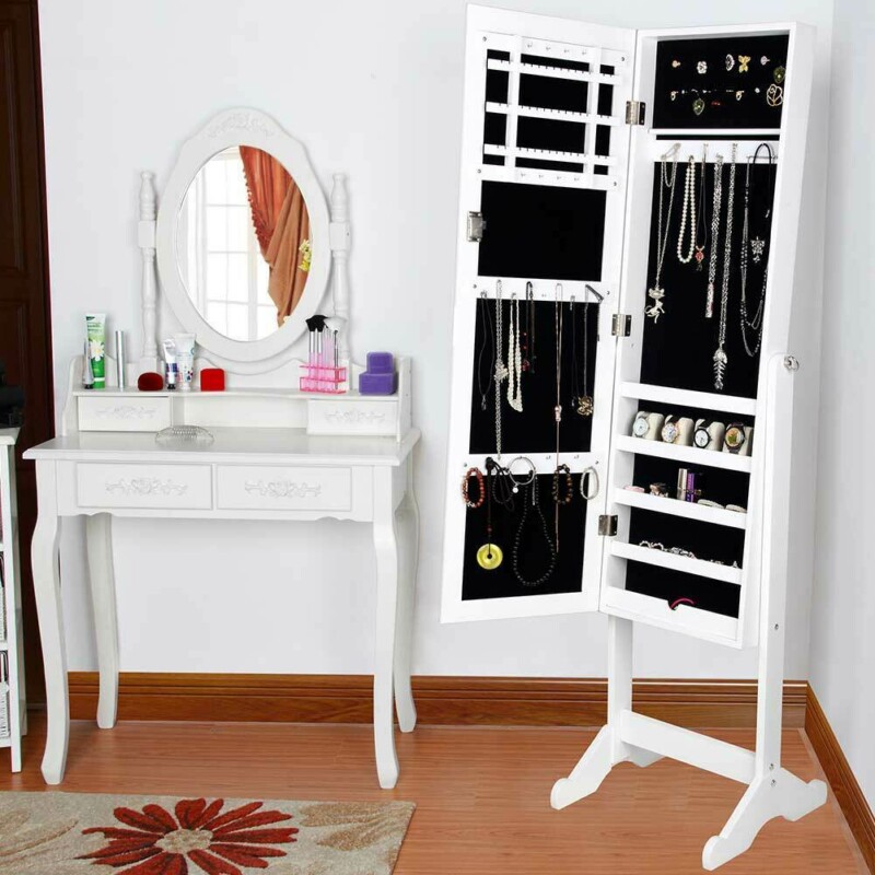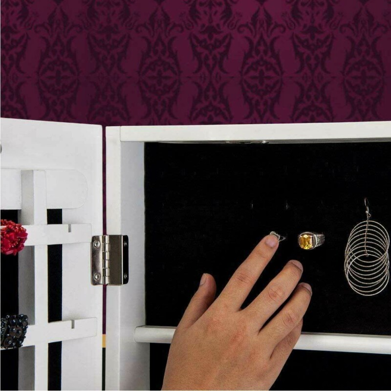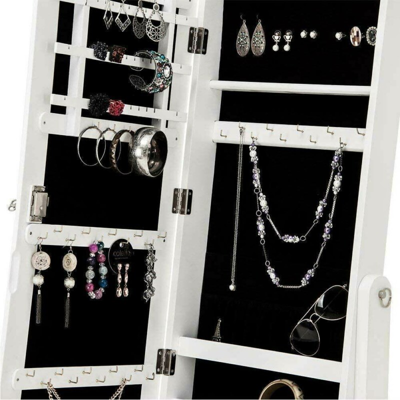 Η καθρέφτης-κοσμηματοθήκη είναι ένας καθρέφτης πλήρους σώματος με πόρτα, ενώ στο εσωτερικό του θα βρείτε πολλούς χώρους και γάντζους για να κρεμάσετε όλα τα κοσμήματα και τα αξεσουάρ σας.