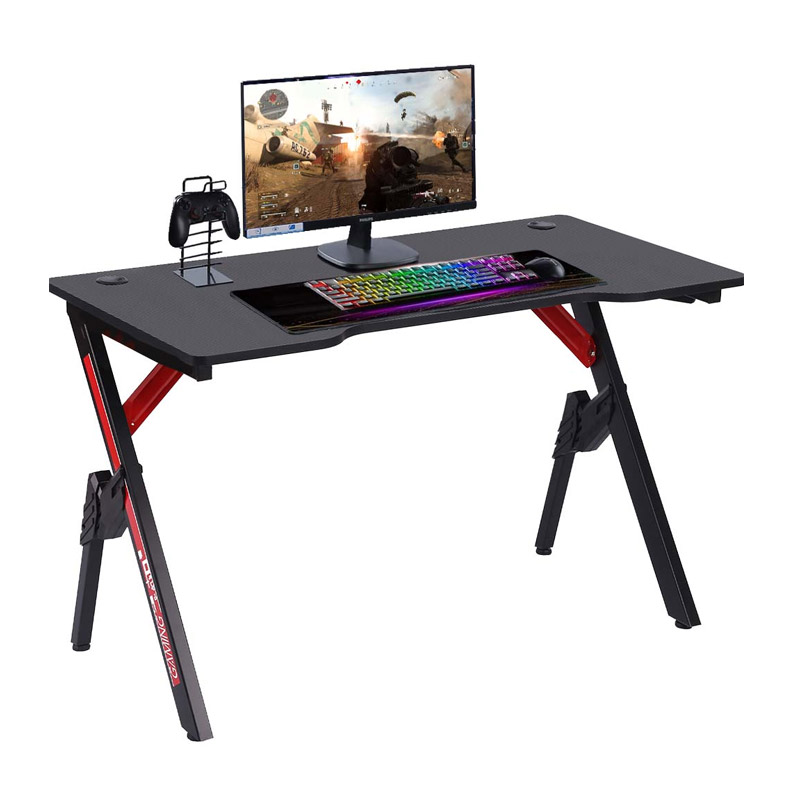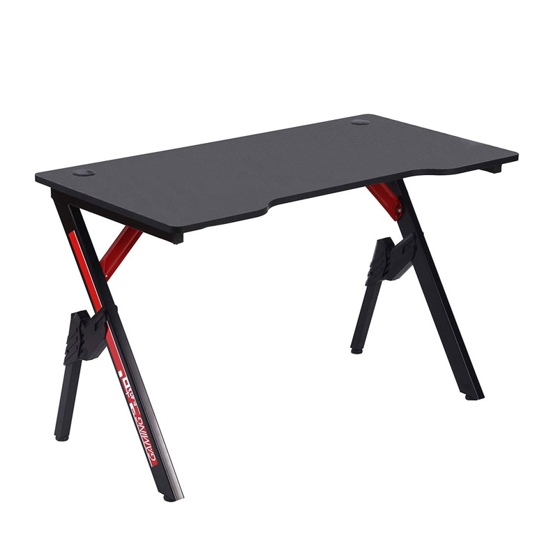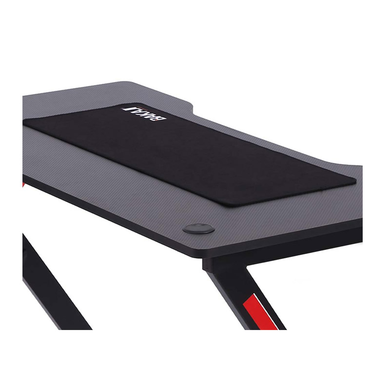 Το γραφείο gaming, από την εταιρία Bakaji, διαθέτει συμπαγή μεταλλικό σκελετό υψηλής ποιότητας σε πολύ έντονο μαύρο χρώμα με κόκκινες λεπτομέρειες, και ξύλινη επιφάνεια από MDF, διακοσμημένη με όμορφη υφή από ανθρακονήματα που το καθιστά κάνει πραγματικά μοναδικό και ιδιαίτερο. Είναι εξοπλισμένο με 2 τρύπες για τα καλώδια αριστερά και δεξιά στην επιφάνεια.