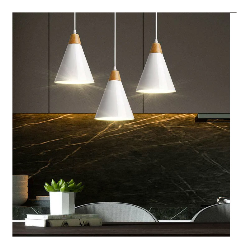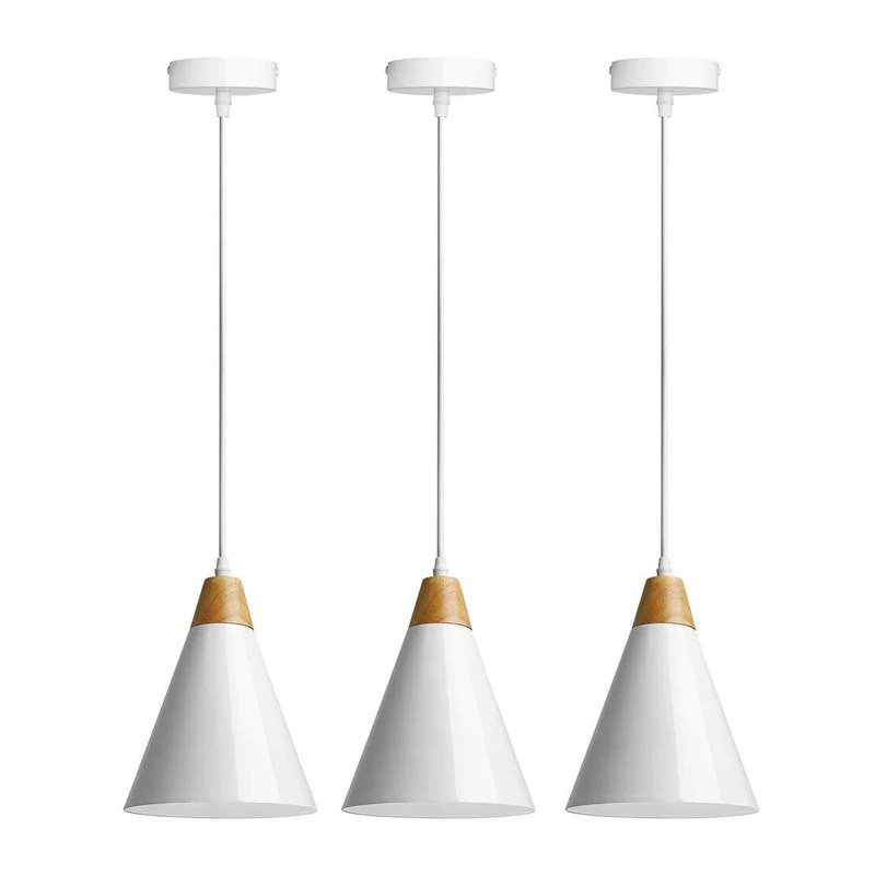 Το σετ, από την εταιρία Bakaji, αποτελείται από 3 κρεμαστά φωτιστικά, τα οποία θα δώσουν μία μοντέρνα πινελιά στο σπίτι σας. Μοντέρνο και μινιμαλιστικό σχέδιο, με αμπαζούρ κατασκευασμένο εξ’ ολοκλήρου από υψηλής ποιότητας μέταλλο σε λευκό χρώμα με επάνω λεπτομέρεια από φυσικό ξύλο, που δίνει μια μοναδική πινελιά στο αμπαζούρ κάνοντας κάθε δωμάτιο του σπιτιού μοναδικό και κομψό. Το αμπαζούρ υποστηρίζει κάθε τύπο λαμπτήρα με πρίζα E27 μέγιστης ισχύος 25 W.