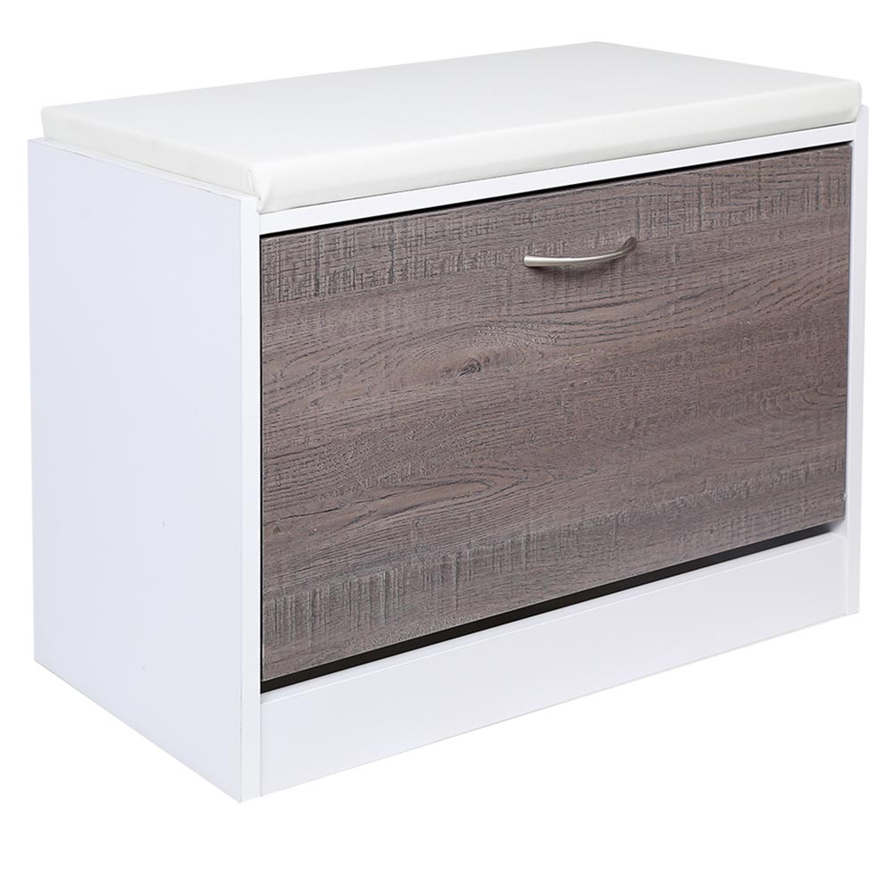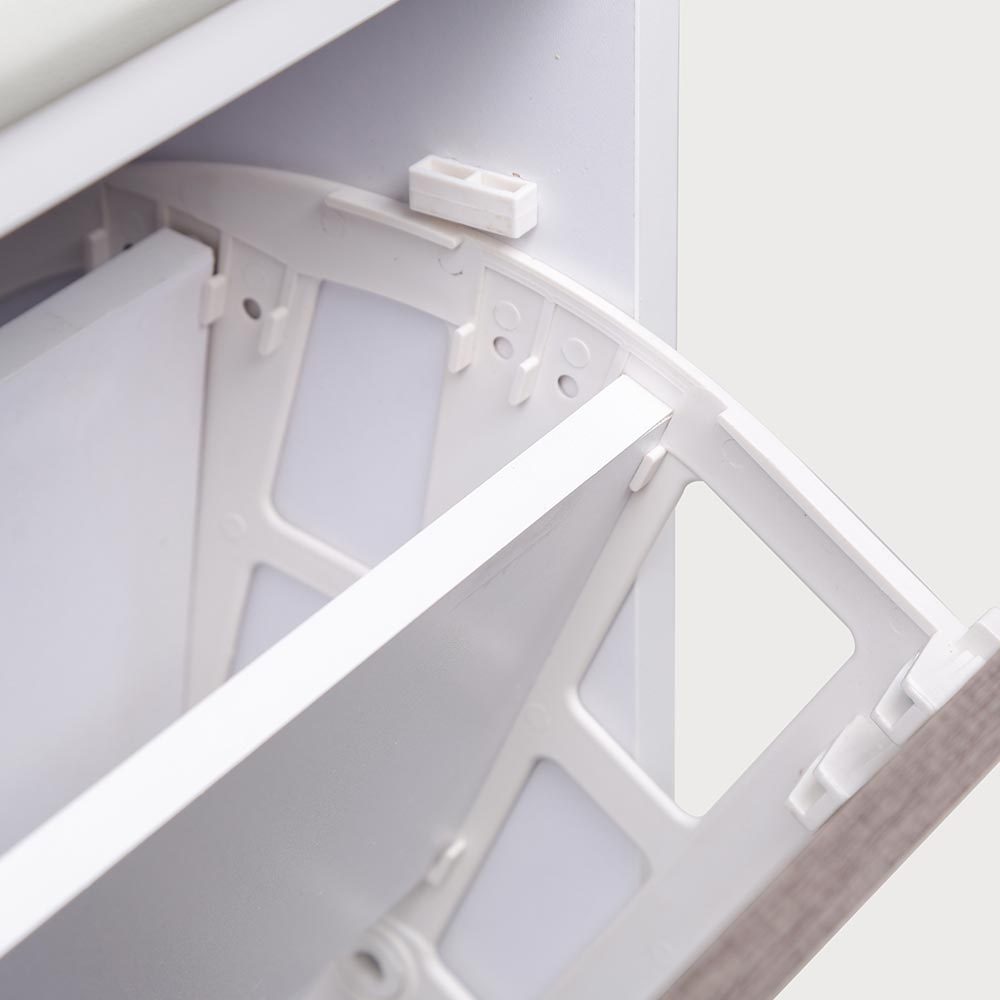 Η κατασκευή είναι από MDF ξύλο, ένα πολύ ανθεκτικό, μακράς διάρκειας και εύκολο στον καθαρισμό υλικό, σε κομψό λευκό χρώμα με πόρτα σε γκρι δρυς που προσδίδει μια μοναδική πινελιά στην παπουτσοθήκη.