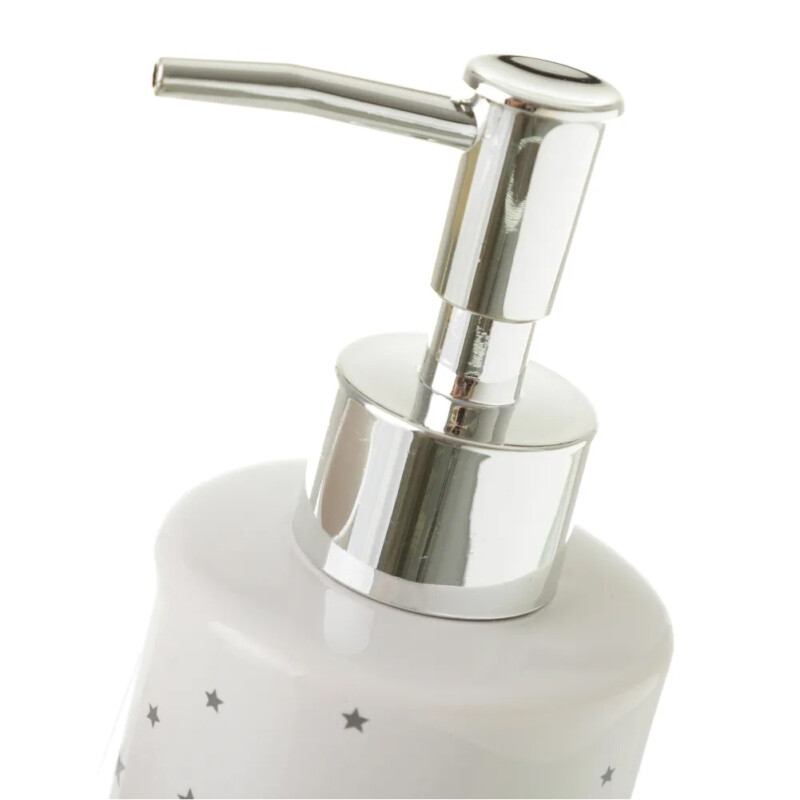 Δώστε στο μπάνιο σας έναν μοναδικό χαρακτήρα με αυτό το όμορφο σετ δύο κομματιών από κεραμική με διακόσμηση γκρι αστεριών. Το σετ περιλαμβάνει δύο λειτουργικά κομμάτια: ένα διανεμητή υγρού σαπουνιού με εύχρηστο στόμιο και μια ποτηροθήκη για οδοντόβουρτσες. Ο διανεμητής είναι κατασκευασμένος από πλαστικό βαμμένο σε ασημί χρώμα, με ενσωματωμένη αντλία για άνετη χρήση κάθε φορά.