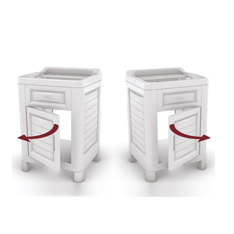 Το ντουλάπι με νιπτήρα, από την εταιρία Bama, είναι κατασκευασμένο από 100% ανακυκλώσιμη ρητίνη. Η μπροστινή πόρτα μπορεί να τοποθετηθεί με άνοιγμα δεξιά ή αριστερά. Με εύκολη συναρμολόγηση και καθαρισμό, ιδανικό και για υπαίθριες εγκαταστάσεις.
