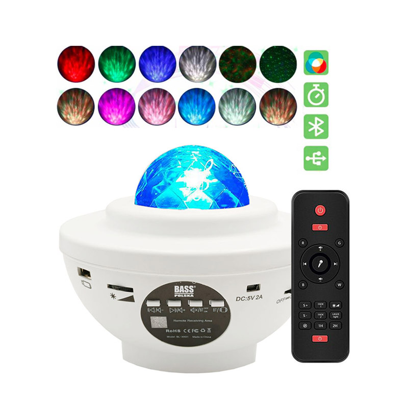 Ο προβολέας, από την εταιρία Bass Polska, μπορεί να χρησιμοποιηθεί ως φωτιστικό, προβολέας αστεριών και κυμάτων και ως ηχείο Bluetooth. Έχει τέσσερα χρωματιστά φώτα (μπλε, κόκκινο, λευκό, πράσινο), δυνατότητα ρύθμισης της ταχύτητας κίνησης του φωτός (χωρίς κίνηση, αργή, μεσαία, γρήγορη), λειτουργία αργής αλλαγής χρώματος με ξεθώριασμα του τρέχοντος χρώματος / χρωμάτων και ομαλή μετάβαση στο επόμενο χρώμα και ρυθμιζόμενη φωτεινότητα φωτός (40%, 70%, 100%). Ο ενσωματωμένος χρονοδιακόπτης σας επιτρέπει να ορίσετε μια ώρα για την αυτόματη απενεργοποίηση του προβολέα.