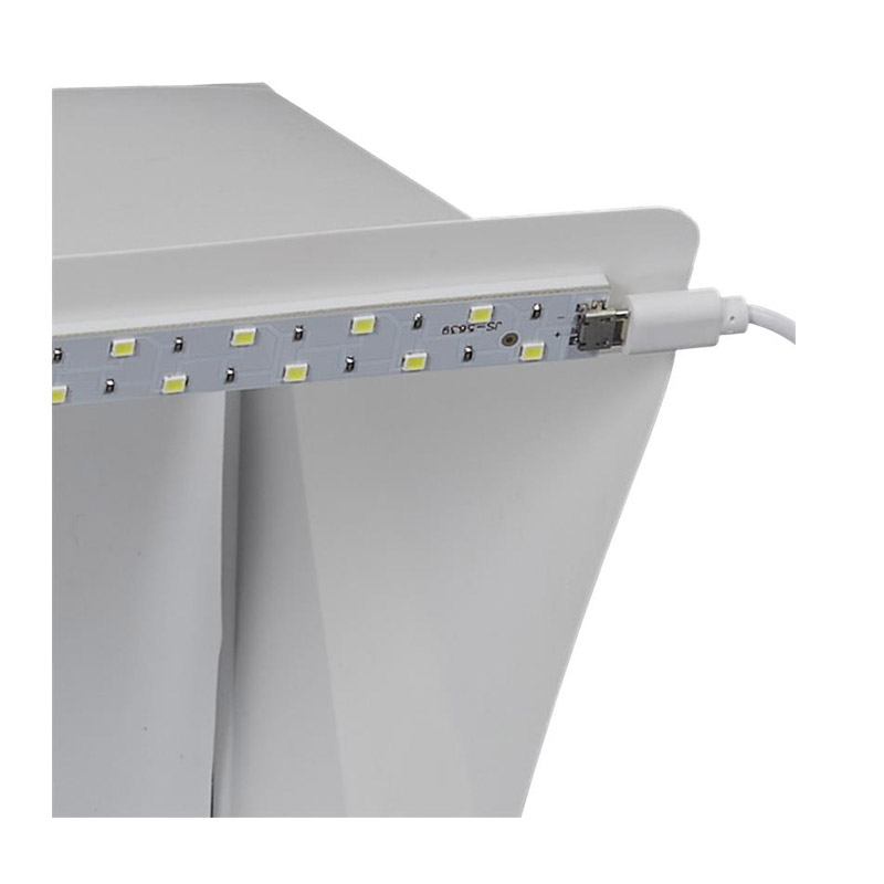 Το στούντιο είναι αναδιπλούμενο, ώστε να μπορείτε εύκολα να το μεταφέρετε ή να το αποθηκεύσετε. Στο πάνω μέρος μια λωρίδα με 20 LED φώτα, σε λευκό ουδέτερο φως, που τροφοδοτείται από ένα καλώδιο USB (συμπεριλαμβάνεται). Για να ενεργοποιήσετε τα φώτα, απλά συνδέετε το καλώδιο USB στο laptop, στο tablet, στο φορτιστή, ή στην πρίζα. Εκτός από το καλώδιο τροφοδοσίας, το σετ περιλαμβάνει 3 υπόβαθρα, λευκό, μαύρο και πράσινο, καθώς και οι οδηγίες χρήσεως.