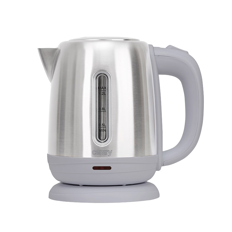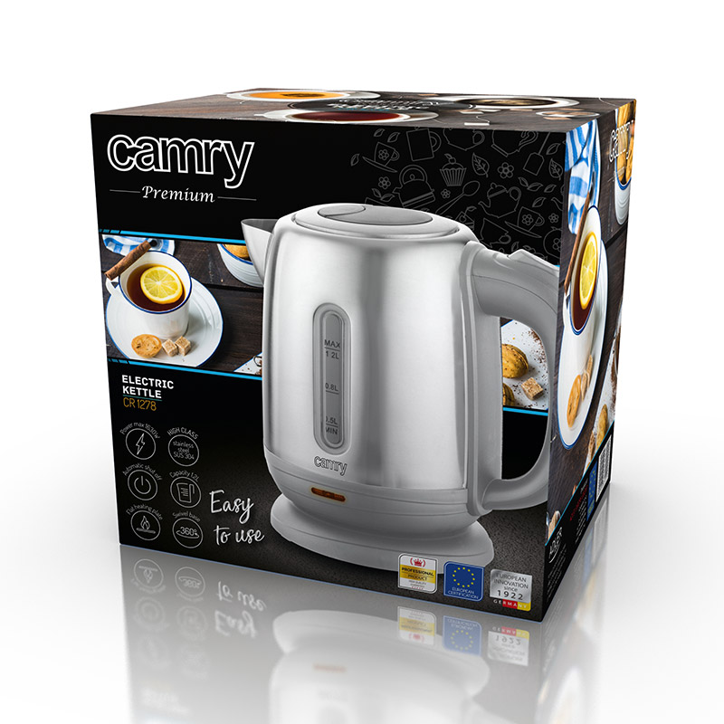 Ο ηλεκτρικός βραστήρας, από την εταιρία Camry, είναι κατασκευασμένος από ανοξείδωτο ατσάλι και είναι εξοπλισμένος με ένα ισχυρό στοιχείο θέρμανσης 1370-1630 W, χαρακτηριστικό το οποίο θερμαίνει γρήγορα το νερό. Έχει χωρητικότητα 1.2 Lt με δείκτη στάθμης νερού και περιστρεφόμενη βάση 360°.