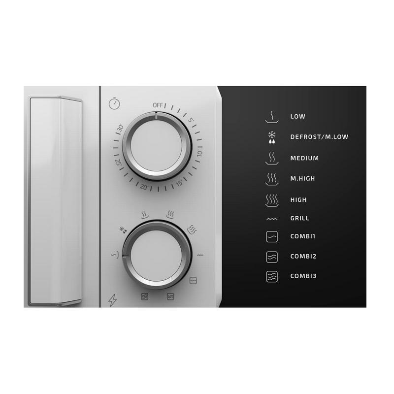 Ο φούρνος διαθέτει κομψό σχεδιασμό με πόρτα FullWhite και μεταλλικές λεπτομέρειες. Με ισχύ στα μικροκύματα 700 W σε 6 επίπεδα, 800 W στο γκριλ με αποδοτικά θερμαντικά στοιχεία αλογόνου, πολύ αποτελεσματικό τρόπο απόψυξης, ο οποίος επιτρέπει στα τρόφιμα να πραγματοποιούν αυτή τη διαδικασία με τον πιο αποτελεσματικό τρόπο, χωρίς να καταστρέφονται τα ίδια και χωρίς να υπάρχουν κρύα σημεία, περιστροφικά χειροκίνητα κουμπιά, χρονόμετρο έως 30 λεπτά και συναγερμό τέλους μαγειρέματος.