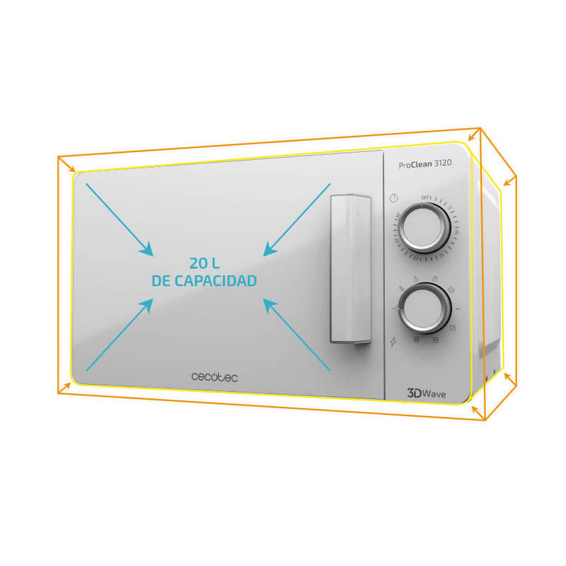 Ο φούρνος μικροκυμάτων ProClean 3120, από την εταιρία Cecotec, θα γίνει απαραίτητος στην κουζίνα σας χάρη στο ευρύ φάσμα λειτουργιών και τρόπων λειτουργίας του. Με το σύστημα 3DWave μπορείτε να θερμάνετε και να ξεπαγώσετε οποιοδήποτε πιάτο θέλετε ομοιογενώς, με τον απλούστερο τρόπο. Η νέα επίστρωση Ready2Clean είναι αντιβακτηριακή, διατηρεί το εσωτερικό του φούρνου σας πολύ πιο καθαρό, ώστε να μπορείτε να αφιερώσετε το χρόνο σας σε αυτό που πραγματικά σας ενδιαφέρει.