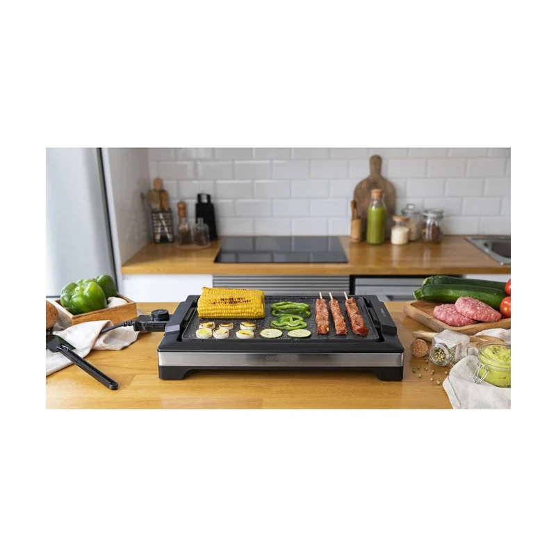 Είναι εξοπλισμένη με ρυθμιζόμενο θερμοστάτη 5 επιπέδων, για να επιλέξετε τη θερμοκρασία που ταιριάζει καλύτερα στο φαγητό που θέλετε να μαγειρέψετε, για να πάρετε ομοιόμορφο και τραγανό αποτέλεσμα. Έχει αφαιρούμενο δίσκο συλλογής λίπους, ο οποίος πλένεται στο πλυντήριο πιάτων, καθώς και αφαιρούμενο καλώδιο τροφοδοσίας ώστε να τη μεταφέρετε στο τραπέζι με ασφάλεια.