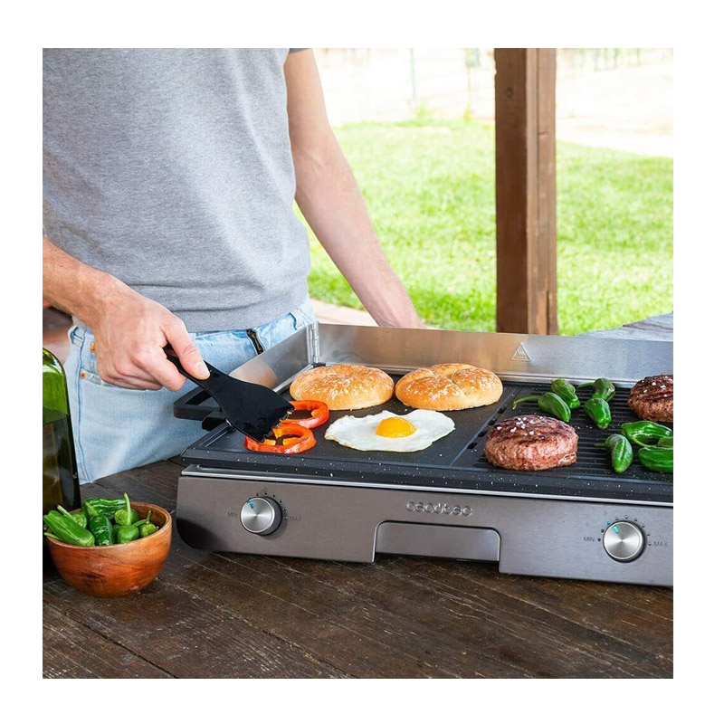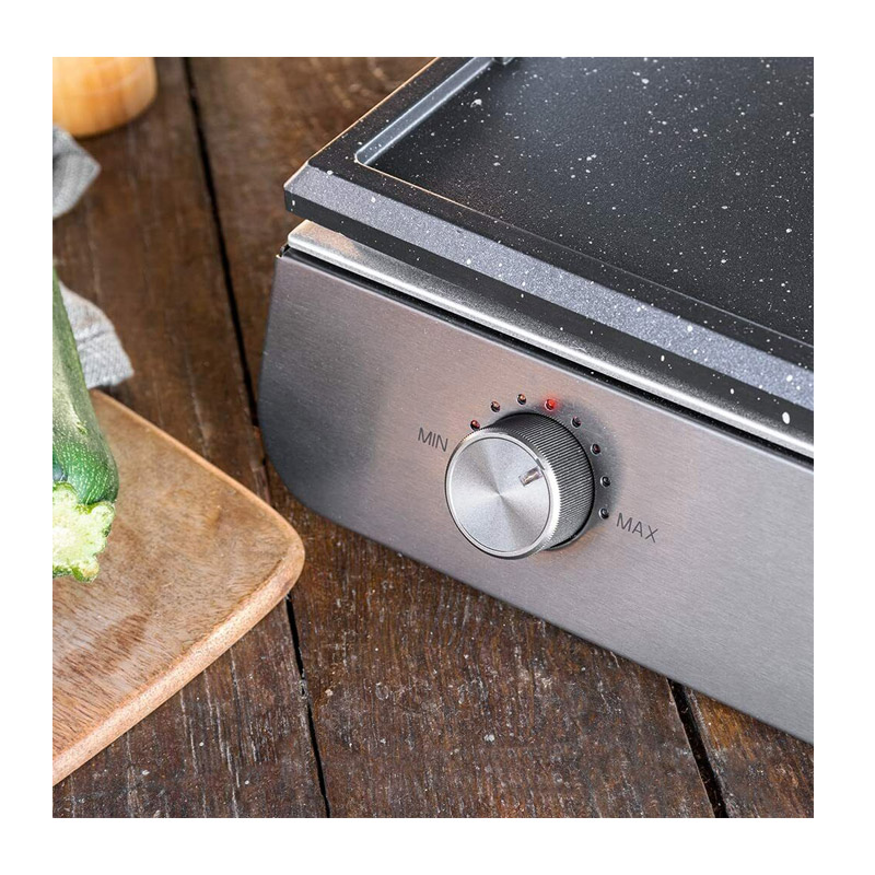 Η ηλεκτρική ψηστιέρα, είναι εξοπλισμένη με αφαιρούμενη πλάκα από χυτό αλουμίνιο με αντικολλητική επίστρωση RockStone για άνετο ψήσιμο, αποτρέποντας το να κολλήσουν τα τρόφιμα. Με ανάμεικτη επιφάνεια ψησίματος, επίπεδη και με ραβδώσεις, για να μαγειρέψετε κρέας, λαχανικά, τηγανητά αυγά ή ακόμα και ψάρια και οστρακοειδή. Οι δύο επιφάνειες έχουν διαφορετικό έλεγχο θερμοκρασίας χάρη στους δύο θερμοστάτες. Ανάλογα με το φαγητό, σας επιτρέπει να μαγειρεύετε ανεξάρτητα σε κάθε πιάτο, ρυθμίζοντας την ώρα και τη θερμοκρασία για να έχετε τα επιθυμητά αποτελέσματα. Κάθε επιφάνεια διαθέτει 6 επίπεδα θερμοκρασίας.