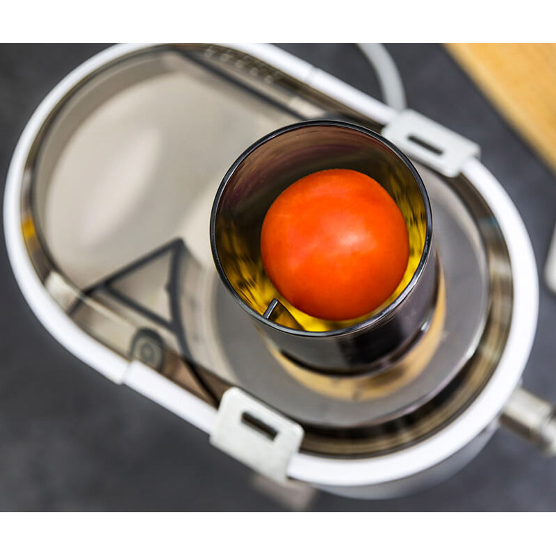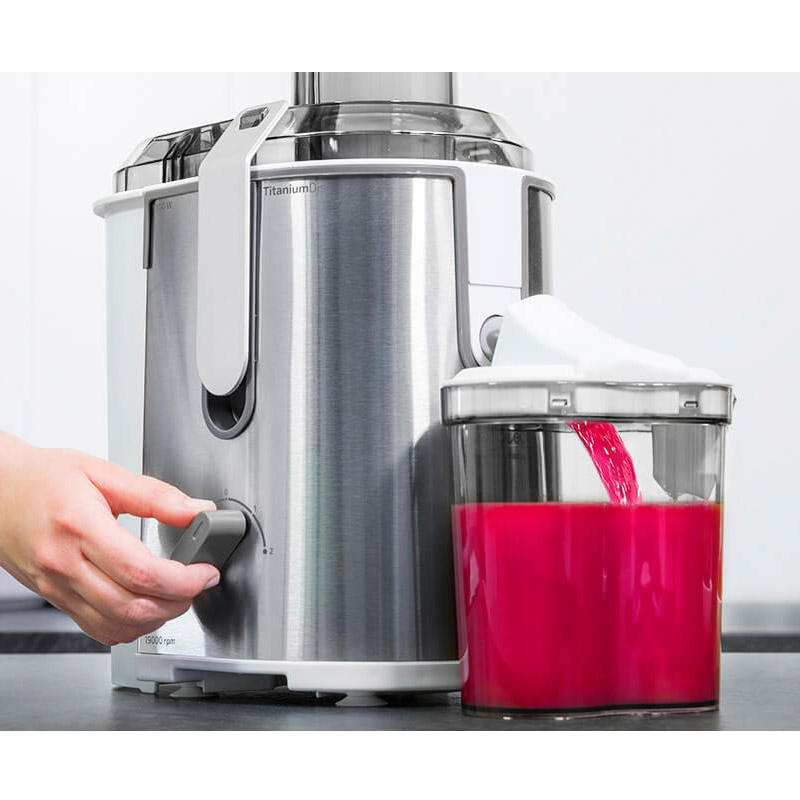 Ο αποχυμωτής, διαθέτει δίσκο με επίστρωση τιτανίου και κανάλι εισόδου XXL διαμέτρου 75 mm, για να μπορείτε να εισάγετε ολόκληρα φρούτα και λαχανικά, χωρίς να χρειάζεται να τα κόψετε. Επιπλέον, διαθέτει σύστημα κατά του σταξίματος, το οποίο εμποδίζει την απόσταξη όταν διαχωρίζεται το δοχείο. Μπορείτε να προσαρμόσετε τον αποχυμωτή χάρη στις 2 ρυθμιζόμενες ταχύτητές του, παίρνοντας πάντα το καλύτερο αποτέλεσμα. Επιπλέον, με τη λειτουργία Turbo, θα έχετε πιο έντονα χτυπήματα, όταν αυτά καθίστανται απαραίτητα. Χάρη στη μεγάλη χωρητικότητα των 2000 ml του δοχείου πολτού, δεν θα χρειαστεί να σταματήσετε τη διαδικασία για να εξαγάγετε τον πολτό.