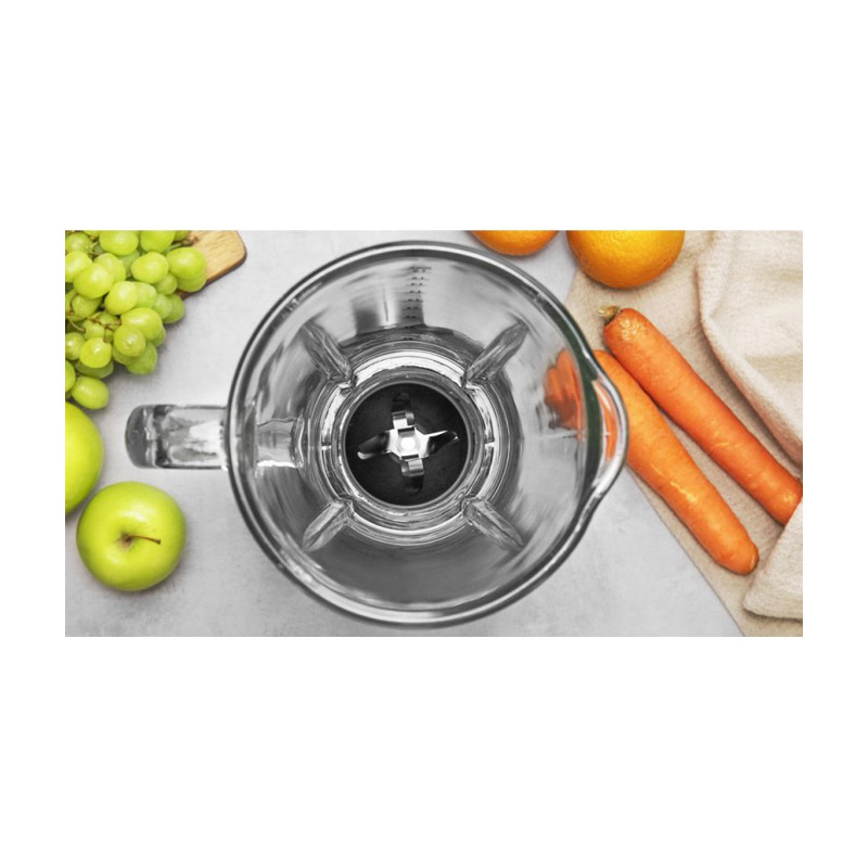 Το μπλέντερ, είναι εξοπλισμένο με λεπίδα 8 φύλλων με επίστρωση τιτανίου υψηλής ποιότητας, που θα σας επιτρέψει να αξιοποιήσετε στο έπακρο όλες τις θρεπτικές ουσίες των τροφίμων και να αποκτήσετε τις καλύτερες υφές. Το τιτάνιο βελτιώνει την σκληρότητα από το ατσάλι, διατηρώντας έτσι τις λεπίδες αιχμηρές για μεγαλύτερο χρονικό διάστημα και με καλύτερα αποτελέσματα. Η κανάτα του έχει χωρητικότητα 1.8 Lt και είναι κατασκευασμένη από λιωμένο γυαλί υψηλής αντοχής, ανθεκτική στις θερμικές διαταραχές, ώστε να μην χρειάζεται να ανησυχείτε όταν φτιάχνετε ζεστές κρέμες ή ψιλοκομμένο πάγο, ενώ πλένεται στο πλυντήριο πιάτων.