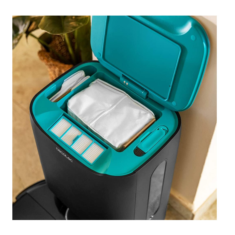 Η βάση, από την εταιρία Cecotec, είναι εξοπλισμένη με το σύστημα SmartClean με το οποίο μπορείτε να αδειάζετε αυτόματα και έξυπνα τη δεξαμενή στερεών της σκούπας ρομπότ. Το σύστημα εντοπίζει εάν έχετε σακούλα και σε αντίθετη περίπτωση σας ειδοποιεί.