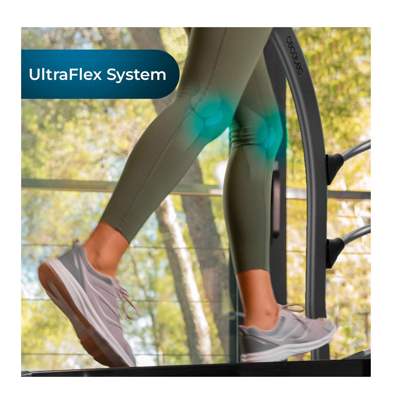 Ο διάδρομος, είναι εξοπλισμένος με το σύστημα UltraFlex, ένα προηγμένο σύστημα απορρόφησης κραδασμών που αποτελείται από 8 ελαστομερή. Ο πίνακας ελέγχου με οθόνη LCD δείχνει ταχύτητα, χρόνο, απόσταση, θερμίδες που καταναλώθηκαν, καρδιακούς παλμούς και λειτουργία σάρωσης.