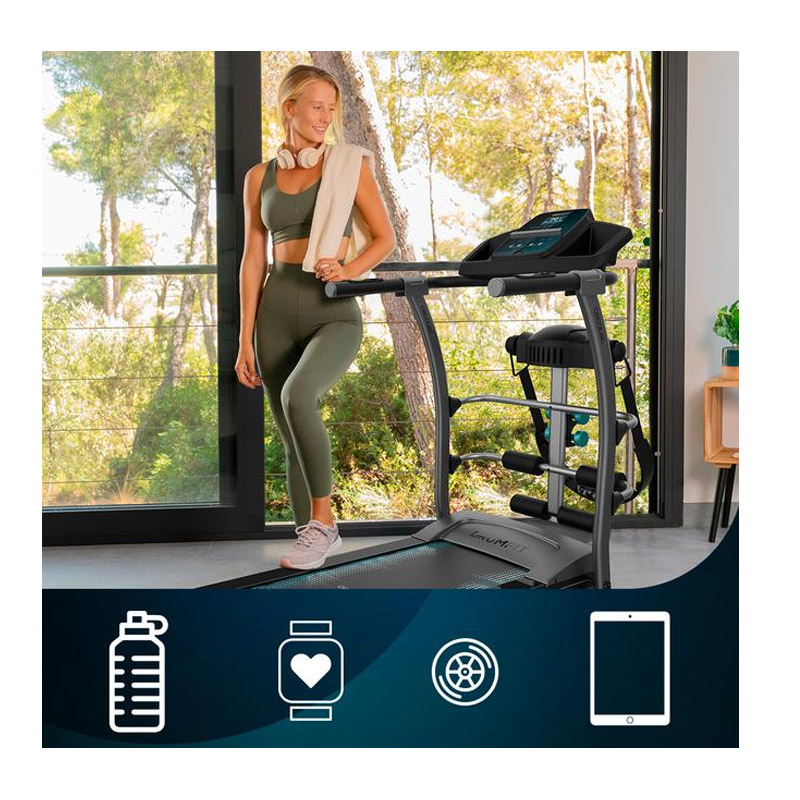Αξεσουάρ: Σετ που αποτελείται από αλτήρες και ράβδους αφρού που μετατρέπουν τον διάδρομό σας σε πολυλειτουργικό προπονητικό μηχάνημα, ενσωματωμένη θήκη για μπουκάλια στην κονσόλα και δονούμενη ζώνη μασάζ με ιδιότητες μείωσης του λίπους που βοηθά στη μείωση του συσσωρευμένου λίπους στην κοιλιά και τη μέση