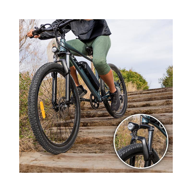 Το ηλεκτρικό ποδήλατο, από την εταιρία Cecotec, διαθέτει ελαφρύ και ανθεκτικό σκελετό αλουμινίου. Με τροχούς 27.5″ για να μπορείτε να κυκλοφορείτε με ασφάλεια, μεγάλη ισχύς μπαταρία 360 Wh (36V10AH) με αυτονομία 55 km, 21 ταχύτητες Shimano, διπλά δισκόφρενα για μέγιστη ασφάλεια σε κάθε ταξίδι, μπροστινή ανάρτηση που μειώνει τις κρούσεις ώστε να μπορείτε να κινηθείτε με απόλυτη άνεση σε οποιαδήποτε επιφάνεια και οθόνη για τον έλεγχο ταχύτητας, χιλιομέτρων, επιπέδου υποβοήθησης και φωτός με μια ματιά.