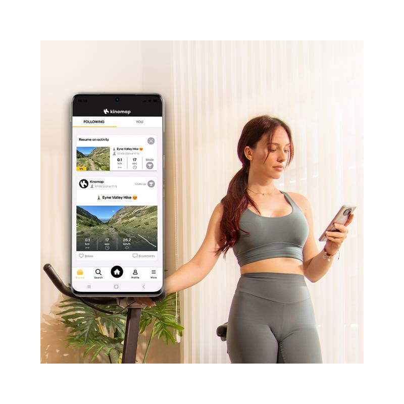 Συνδυάζοντας το ποδήλατό σας με την εφαρμογή Kinomap, θα μπορείτε να επωφεληθείτε από οφέλη όπως ο διαδικτυακός ανταγωνισμός με άλλους χρήστες, η παρακολούθηση των προπονήσεων σας και η εξερεύνηση διαφόρων διαδρομών. Επιπλέον, θα μπορείτε να προσαρμόσετε την αντίσταση ανάλογα με κάθε στάδιο της επιλεγμένης διαδρομής, κάτι που θα κάνει την προπόνησή σας πιο δυναμική και ρεαλιστική. Το μέγιστο βάρος χρήστη είναι 120 Kg και το μέγιστο συνιστώμενο ύψος χρήστη είναι 190 cm.