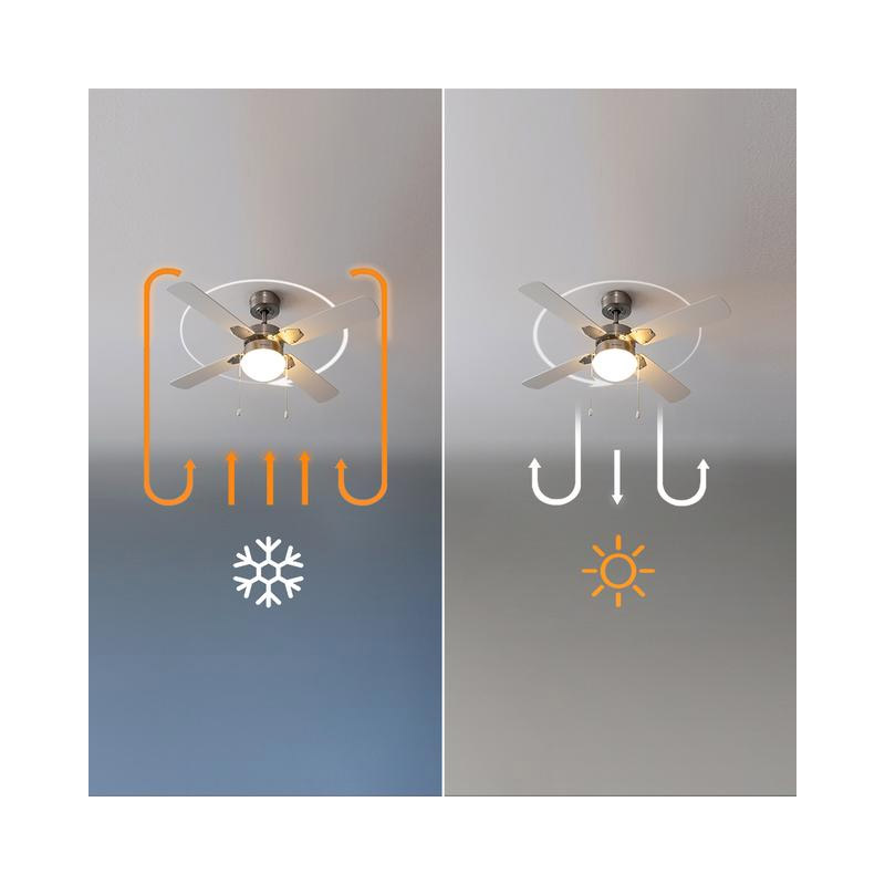Ο ανεμιστήρας διαθέτει σύστημα αντιστροφής περιστροφής κινητήρα για την εκτέλεση της λειτουργίας καλοκαίρι/χειμώνα. Στρίβοντας προς μία κατεύθυνση, θα μπορείτε να απολαύσετε ένα ευχάριστο αεράκι το καλοκαίρι και, προς την αντίθετη κατεύθυνση, ο ανεμιστήρας θα σπρώχνει τον ζεστό αέρα προς το πάτωμα και θα συμπληρώνει το σύστημα θέρμανσης σας το χειμώνα.