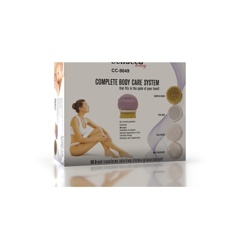 Το σύστημα περιποίησης προσώπου και σώματος, από την εταιρία Cenocco, περιλαμβάνει βούρτσα για τον καθαρισμό του προσώπου με εξαιρετικά μαλακές φυσικές τρίχες, βούρτσα για απολέπιση και απομάκρυνση του νεκρού δέρματος στο σώμα, ειδική κεφαλή για την αφαίρεση του σκληρού δέρματος στις φτέρνες των ποδιών και κεφαλή για μασάζ στους μυς αυξάνοντας την κυκλοφορία του αίματος.