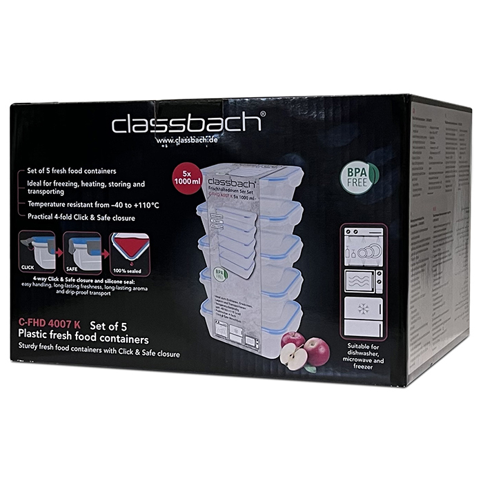 Σετ Φαγητοδοχεία 5 Τεμαχίων με Αεροστεγές Κλείσιμο – Διάφανο/Γαλάζιο C-FHD4007K CLASSBACH
