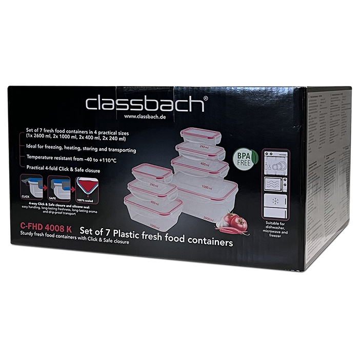 Οργανώστε εύκολα την κουζίνα και την καθημερινότητά σας με το σετ 7 δοχείων αποθήκευσης τροφίμων της CLASSBACH. Ιδανικά για κατάψυξη, ζέσταμα και μεταφορά γευμάτων, διαθέτουν πρακτικά μεγέθη και αεροστεγές κλείσιμο για διατήρηση της φρεσκάδας. Με διάφανη σχεδίαση και στοιβαζόμενο σχήμα για εξοικονόμηση χώρου, αυτά τα δοχεία είναι η τέλεια λύση για κάθε κουζίνα.