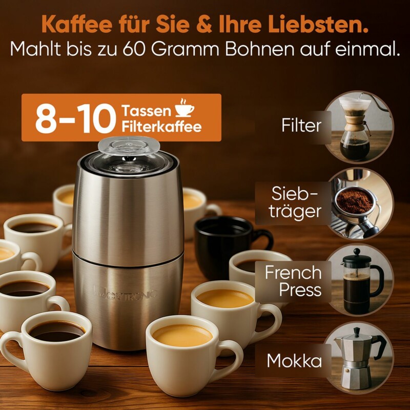 Ο Clatronic KSW 3807 είναι ένας ισχυρός αλλά αθόρυβος ηλεκτρικός μύλος καφέ, ιδανικός για όσους αναζητούν ποιότητα και ευκολία στην καθημερινή παρασκευή καφέ. Διαθέτει ανοξείδωτο περίβλημα και διπλή λεπίδα από ανοξείδωτο ατσάλι, προσφέροντας υγιεινή χρήση και άλεση ακριβείας. Το δοχείο από ανοξείδωτο ατσάλι είναι εύκολο στον καθαρισμό και έχει χωρητικότητα 60 γραμμαρίων, που αρκεί για έως και 10 φλιτζάνια καφέ φίλτρου.