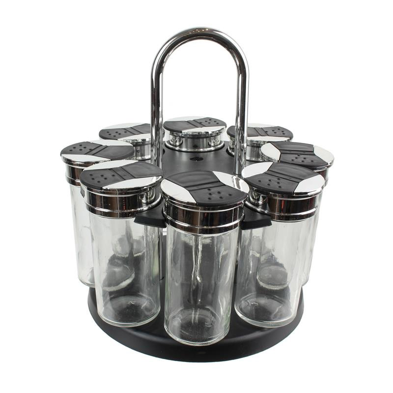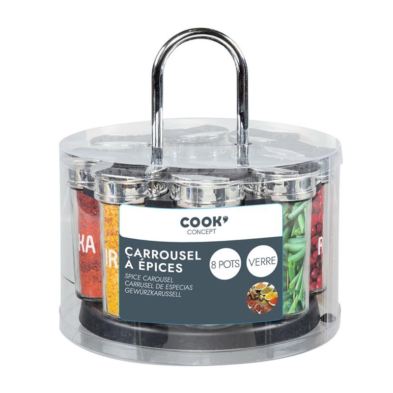 Το σετ, από την εταιρία Cook Concept, αποτελείται από 8 γυάλινα βάζα για μπαχαρικά. Τα βάζα διαθέτουν καπάκια με διπλό άνοιγμα και είναι τοποθετημένα σε περιστρεφόμενη βάση.