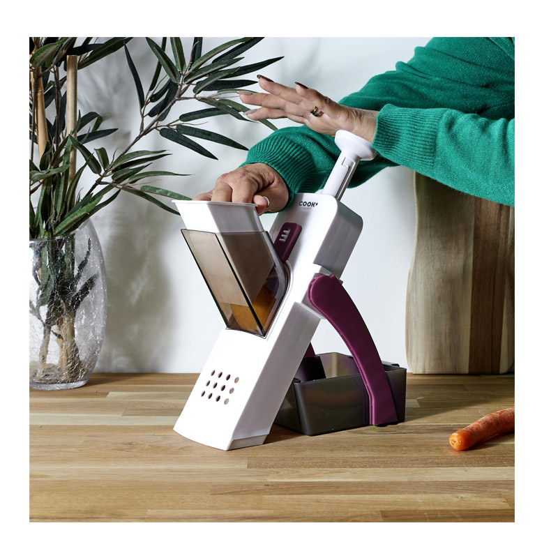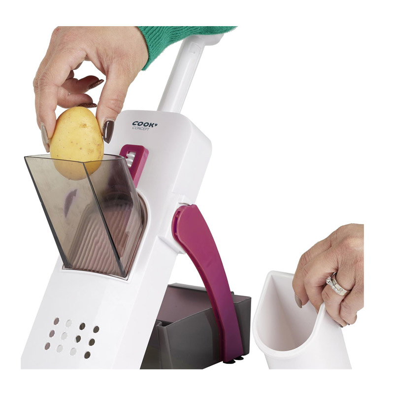 Ο πολυκόπτης λαχανικών, από την εταιρία Cook Concept, διαθέτει πλαστική κατασκευή, ατσάλινες λεπίδες και δοχείο αποθήκευσης. Μπορείτε να κόψετε λαχανικά και φρούτα με ομοιόμορφο πάχος. Τοποθετείτε το λαχανικό ή φρούτο κατά μήκος του μαντολίνου μέχρι να φτάσει στη λεπίδα που διαθέτει και κόβετε σε φέτες.