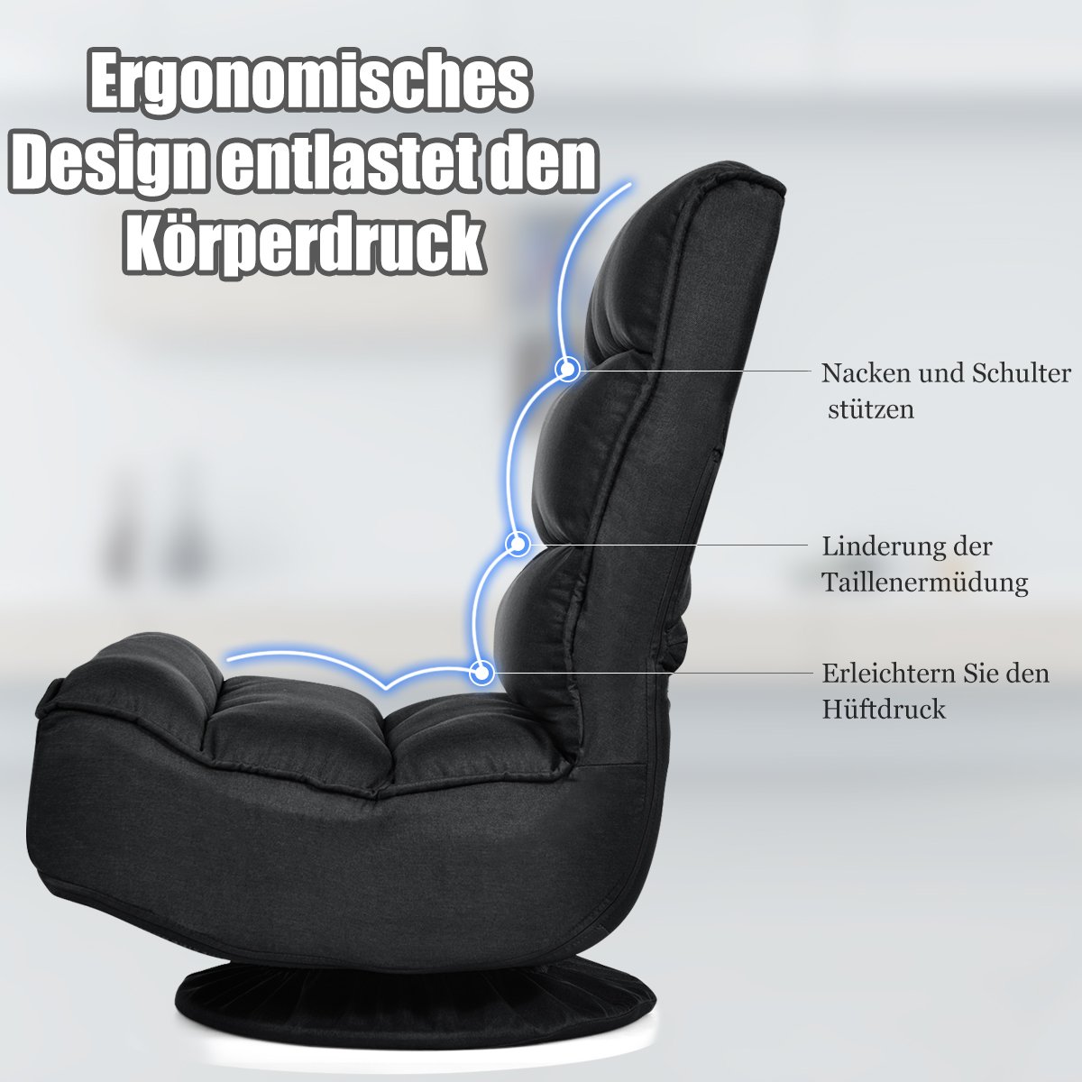 Αυτή η περιστρεφόμενη καρέκλα είναι πυκνά επενδεδυμένη και αισθάνεται μαλακή. Το υψηλής ποιότητας υφασμάτινο κάλυμμα είναι αναπνεύσιμο, ανθεκτικό στο σχίσιμο και ανθεκτικό. Σε σύγκριση με άλλες συνηθισμένες καρέκλες δαπέδου, το μοντέλο μας διαθέτει σχεδιασμό περιστροφής 360 μοιρών, που προσφέρει διασκέδαση. Η πλάτη είναι ρυθμιζόμενη σε 5 γωνίες, επιτρέποντάς σας να βρείτε την πιο άνετη θέση καθίσματος. Επιπλέον, αυτή η περιστρεφόμενη καρέκλα διαθέτει αφαιρούμενο κάλυμμα δαπέδου για προστασία από γρατσουνιές. Σε περίπτωση ρύπανσης, αφαιρείται εύκολα για καθαρισμό. Η πλάτη είναι αναδιπλούμενη για εύκολη αποθήκευση. Με την απλή και μοντέρνα εμφάνισή της, ταιριάζει τέλεια σε κάθε στυλ διακόσμησης.