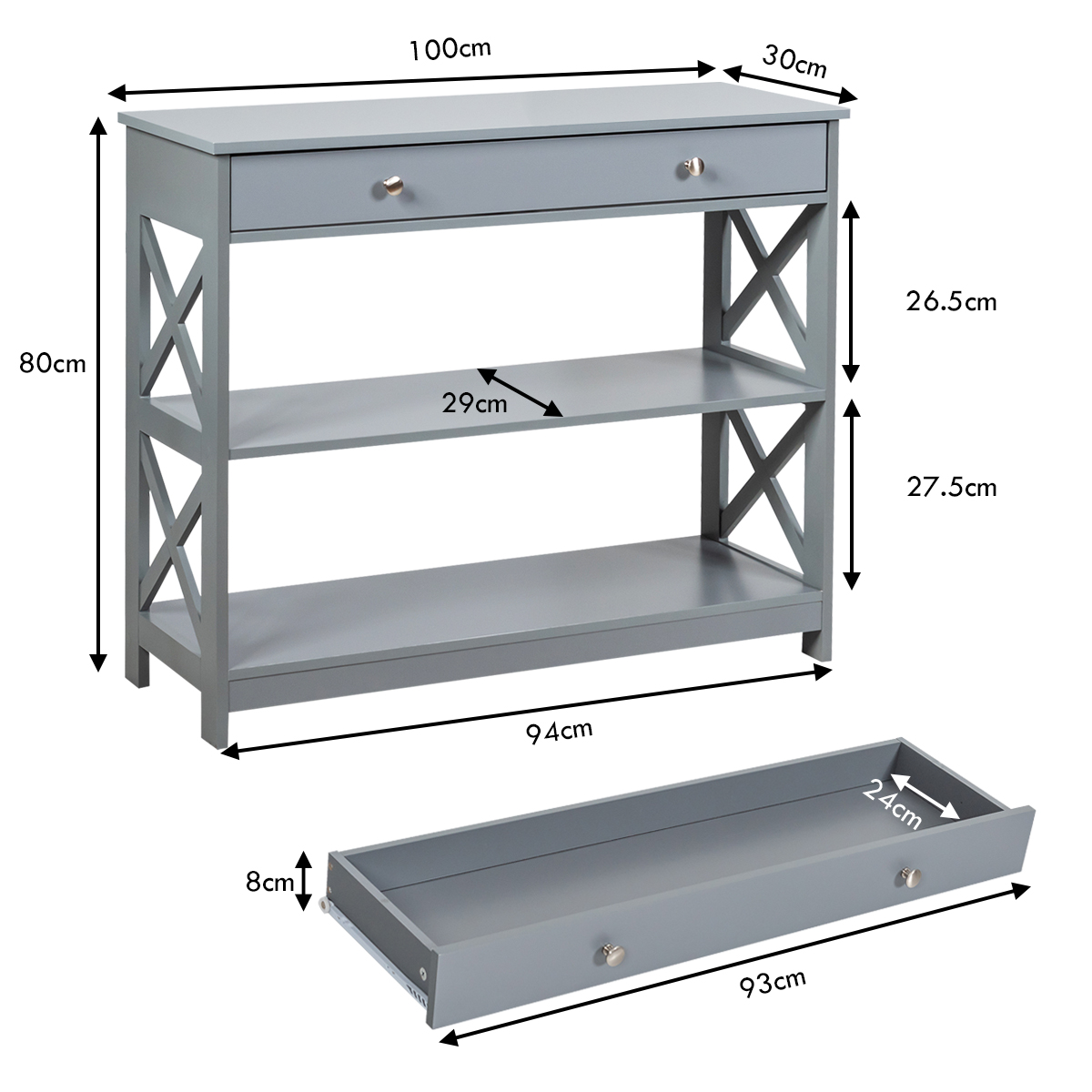 Costway Κονσόλα 3 επιπέδων με συρτάρι, ξύλινη, γκρι, 100 x 30 x 80 cm. HW66090GR
