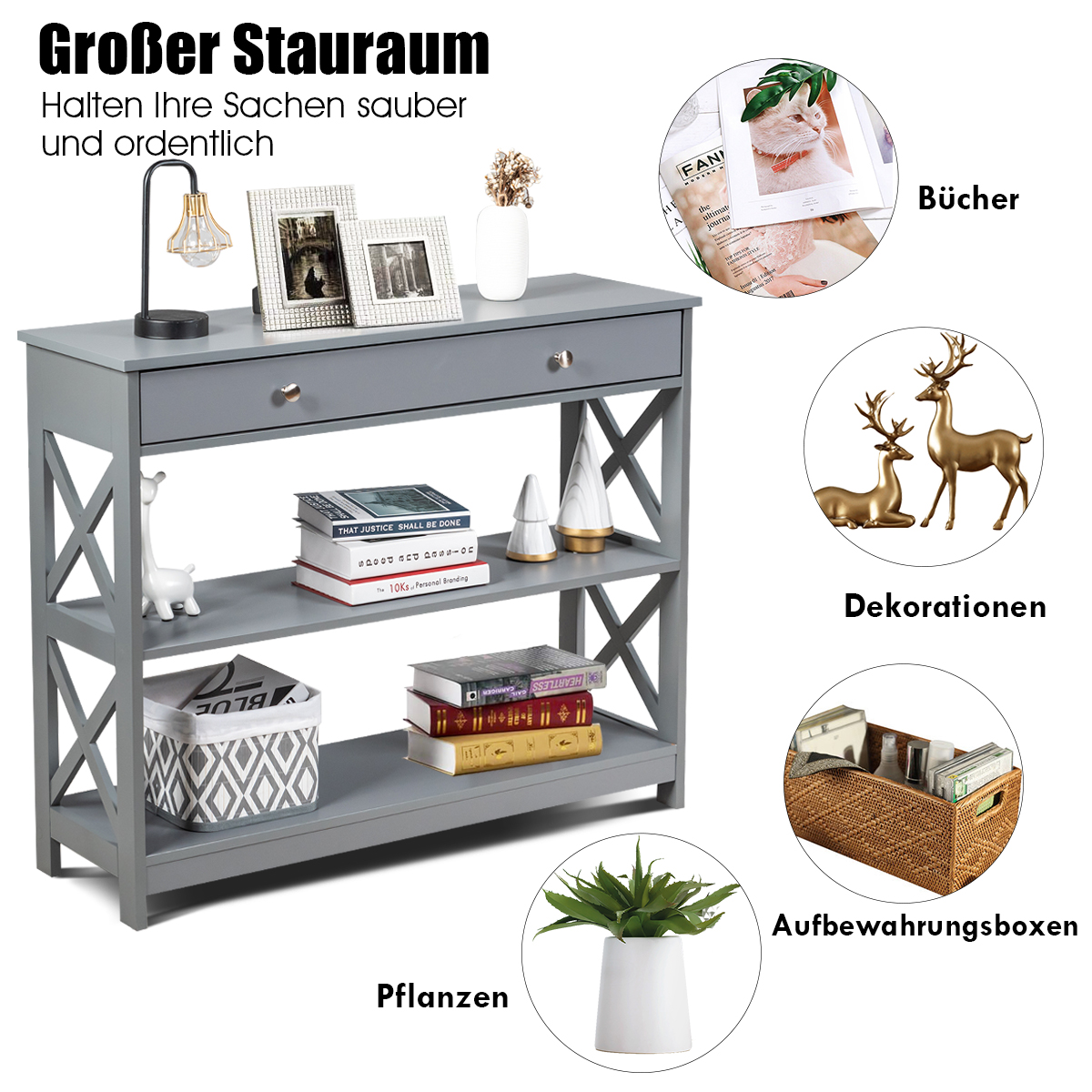 - Ευρύχωρος αποθηκευτικός χώρος: Με μέγεθος 100 x 30 εκ. (Μ x Π), η ευρύχωρη επιφάνεια προσφέρει χώρο για διάφορα αντικείμενα, όπως κορνίζες, σουβενίρ και άλλες διακοσμήσεις. Στο μεγάλο συρτάρι μπορείτε να αποθηκεύσετε κλειδιά, γυαλιά ηλίου και έγγραφα. Επιπλέον, μπορείτε να τοποθετήσετε κουτιά αποθήκευσης ή παπούτσια στα 2 ράφια.