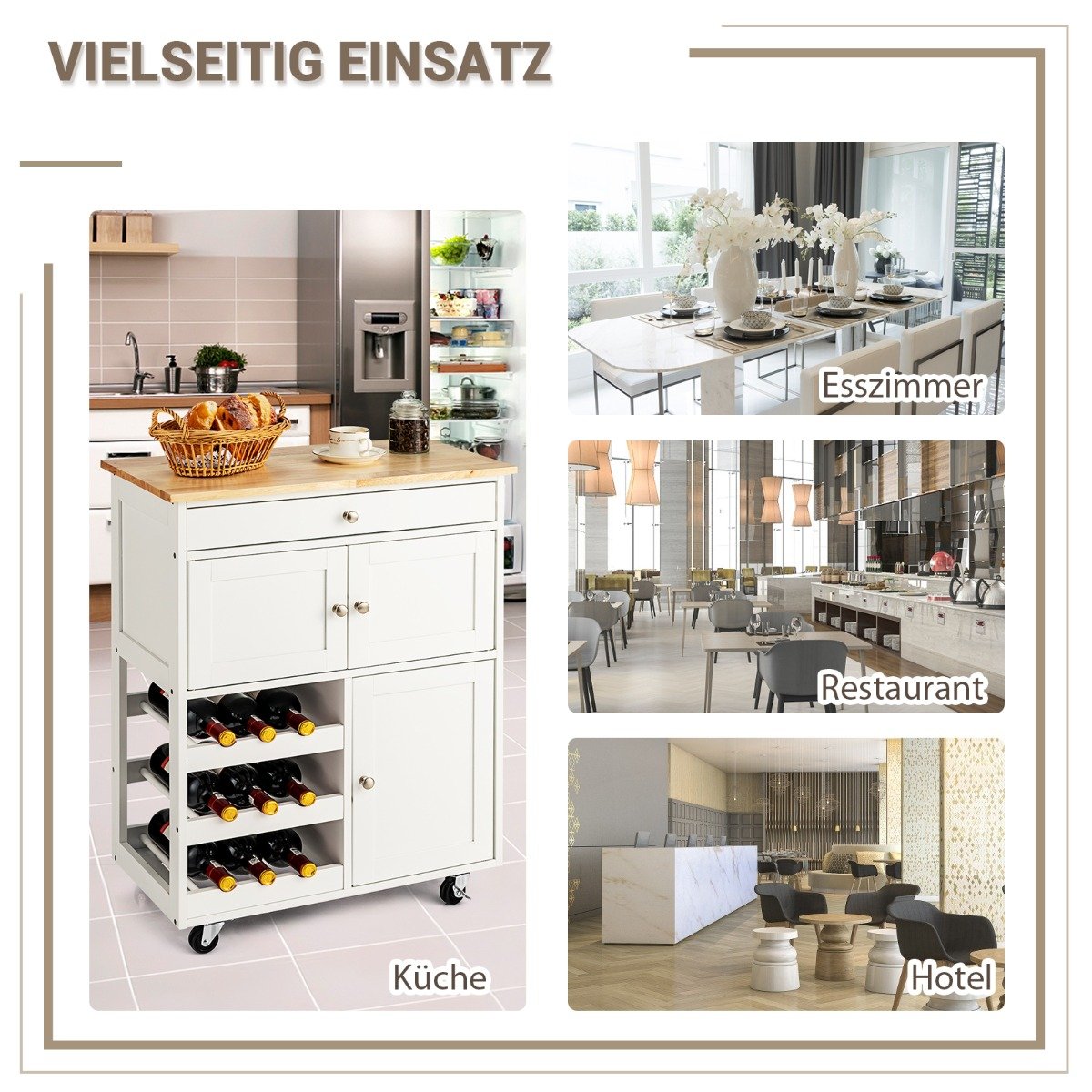 Το όμορφο ξύλινο τρόλεϊ κουζίνας μας είναι σταθερό και προσφέρει πολύ αποθηκευτικό χώρο για διάφορα σκεύη στην κουζίνα σας. Το πρακτικό καροτσάκι κουζίνας διαθέτει ένα συρτάρι, 3 ντουλάπια και 3 ράφια για κρασιά. Το ράφι προσφέρει ιδανικές επιφάνειες αποθήκευσης για πιάτα και πολλά άλλα αντικείμενα. Με ροδάκια είναι πολύ ευέλικτο και είναι ιδανικό για κάθε κουζίνα και εστιατόριο.
