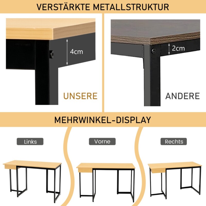 Ένα πρακτικό γραφείο υπολογιστή είναι ιδανικό για αποδοτική εργασία. Η ευρεία επιφάνεια εργασίας και το βαθύ συρτάρι προσφέρουν άφθονο χώρο αποθήκευσης για γραφική ύλη, υπολογιστές, έγγραφα κ.λπ. Με μεταλλικό σκελετό, το γραφείο εργασίας είναι πολύ σταθερό και επιτρέπει αποδοτική εργασία. Οι μεταλλικοί σωλήνες έχουν πλάτος έως 4 εκ. Επιπλέον, τα κανονικά πόδια και τα Τ-σχήματος πόδια διαθέτουν ρυθμιζόμενα μαξιλαράκια που αποτρέπουν τις γρατσουνιές στο πάτωμα και εξασφαλίζουν καλή ισορροπία. Ανάλογα με τις ανάγκες σας, είναι επίσης ιδανικό για την τοποθέτηση του εξοπλισμού gaming στο σαλόνι, το υπνοδωμάτιο, το γραφείο στο σπίτι κ.λπ. Δεδομένου ότι η εγκατάσταση και ο καθαρισμός είναι πολύ εύκολα, αποφεύγονται πολλά προβλήματα.