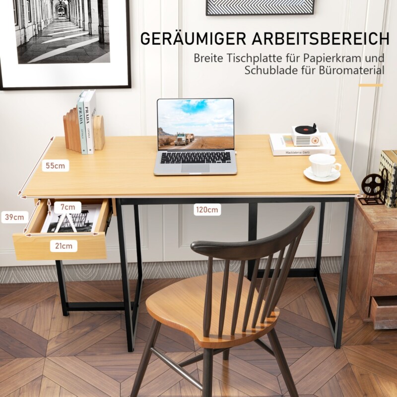 - Ευρύχωρη επιφάνεια εργασίας: Με γραφείο 120 εκ. x 55 εκ. x 75 εκ. (Μ x Π x Υ), ο υπολογιστής σας τοποθετείται τέλεια, ενώ υπάρχει αρκετός χώρος για διακοσμήσεις και ελεύθερη εργασία. Επιπλέον, το γραφείο διαθέτει βαθύ συρτάρι με διαστάσεις 21 εκ. x 39 εκ. x 7 εκ. (Μ x Π x Υ) που προσφέρει αρκετό χώρο για σημαντικά έγγραφα.